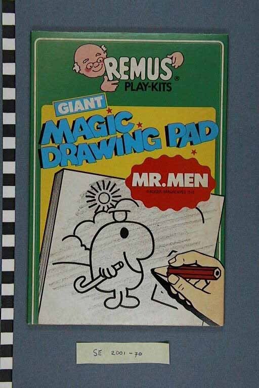 Remus play-kits blok: Giant magic drawing pad. Met groene kartonnen omslag. Prodnr. is 3075. Uitvoering toverkrasblok Mr. Men.