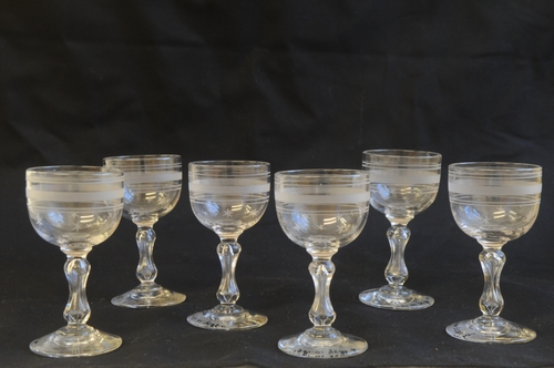 Likeurglaasje - 20e eeuw, materiaal: glas, afmetingen: 8,5 x 4,5 cm, geslepen glas met ronde standvoet, zeskantige nodus met een bolvormige uitloop boven en onder, drinkbeker gedeelte met omlopende decoratieve banden en vijfpuntige sterretjes