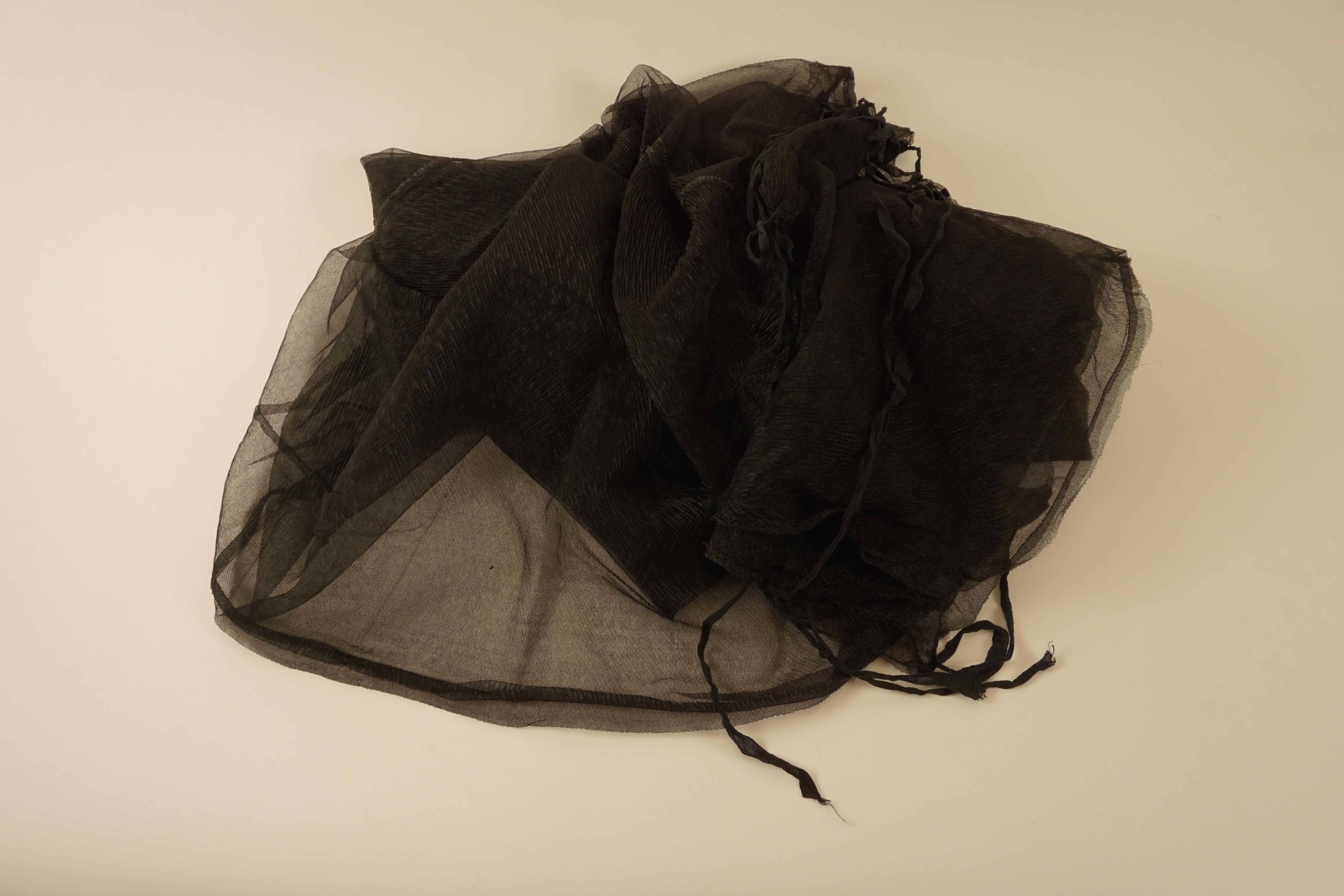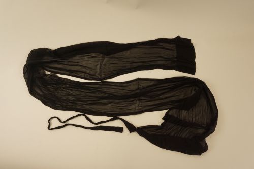 Rouwfalie bij het vaandel van de Nationale R.K. Vereeniging van Geheelonthouders onder Nederlandsch Spoor- en Trampersoneel St. Franciscus, Afdeeling Eindhoven, materiaal: crepe, kleur: zwart, lengte 208 cm, breedte 41 cm, bandje 96 cm lang en 4 cm breed dubbel gemaakt van zwarte voile hoort bij vaandel inv.nr 1988.06.27 a