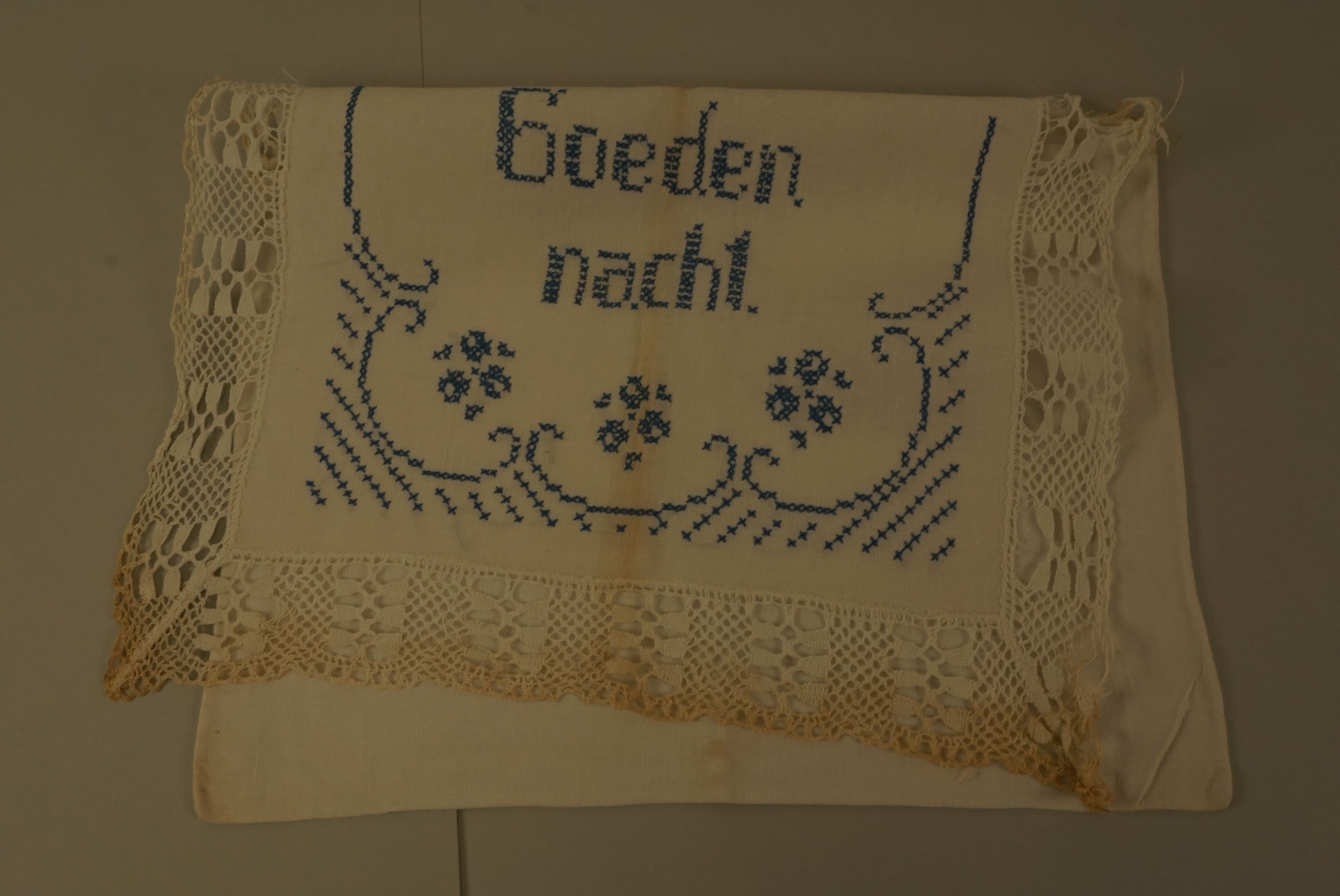 Pyamatas (nachtkledingtas), materiaal: katoen, kleur: wit, lengte 33,5 cm., breedte 45 cm., overslag geborduurd in kruissteken Goeden nacht en randversiering in blauw, overslag is aan drie zijden met 6 cm brede kant afgezet