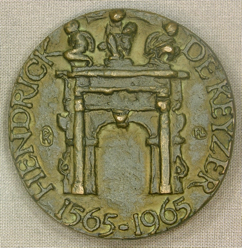 Hendrick de Keyser – 1965, Jaarpenning Ver. voor Penningkunst, gietpenning, brons, diam. 62 mm, vz.: portret en profil van Hendrick de Keyser n.r., kz.: reliëfafbeelding van toegangspoort van het Rasp- of Tuchthuis van Amsterdam, ontworpen en gebeeldhouwd door de Keyser met randschrift “HENDRICK DE KEYSER 1565 – 1965”, gemonogrammeerd op kz. FL, gemonogrameerd op kz. ...
