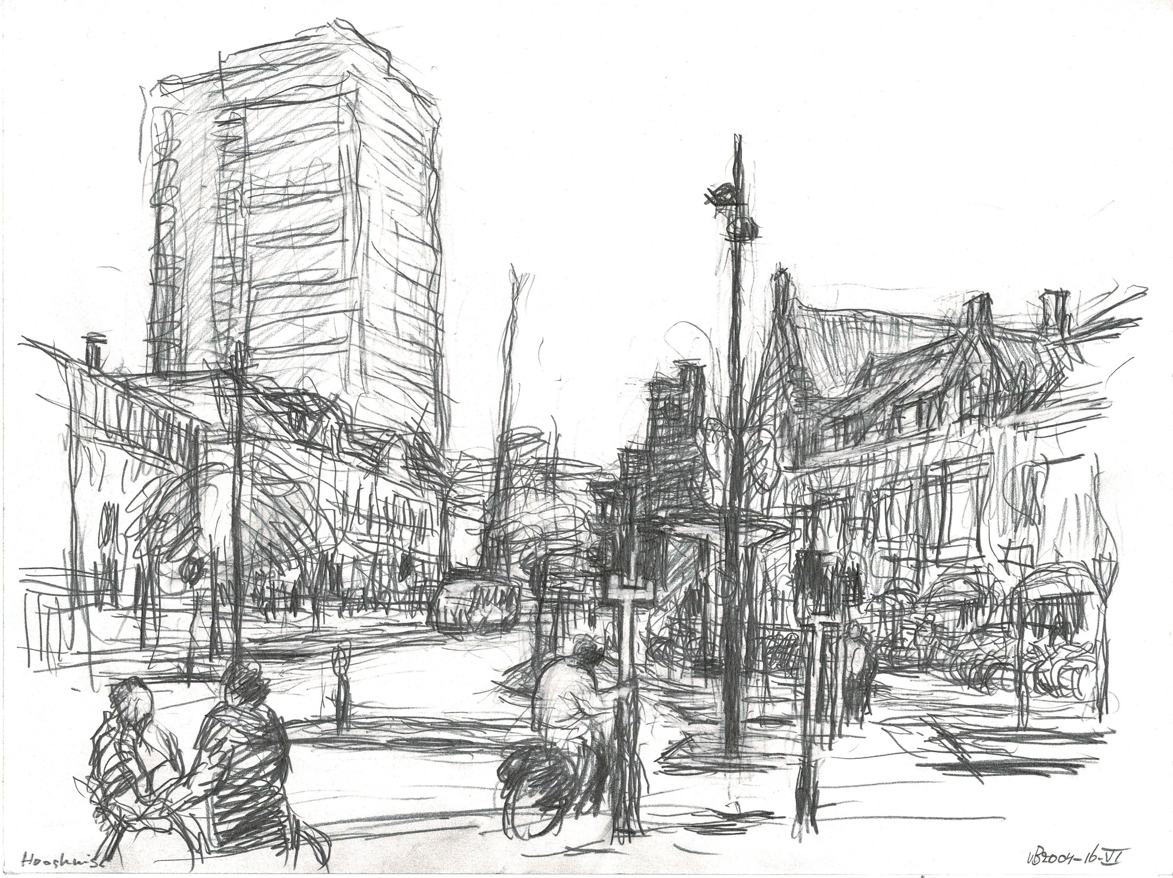 Hooghuis (Hoek Willemstraat en Keizersgracht Eindhoven) – 2004, potlood/papier, 240 x 320 mm, gemonogrammeerd en gedateerd in potlood r.o.: vB 2004-16-VI, gelocaliseerd potlood l.o.: Hooghuis, gesigneerd potlood a.z.: Antoon v. Bakel