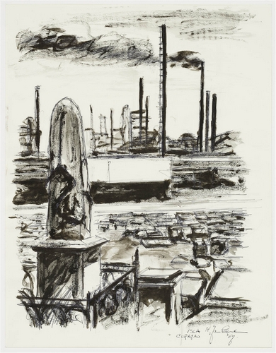 Isla op Curacao – 1967, zwart krijt en oostindische inkt, gewassen/papier, 360 x 280 mm, gelocaliseerd, gesigneerd en gedateerd r.o.: ISLA CURACAO H. Jan Schouten ’67
