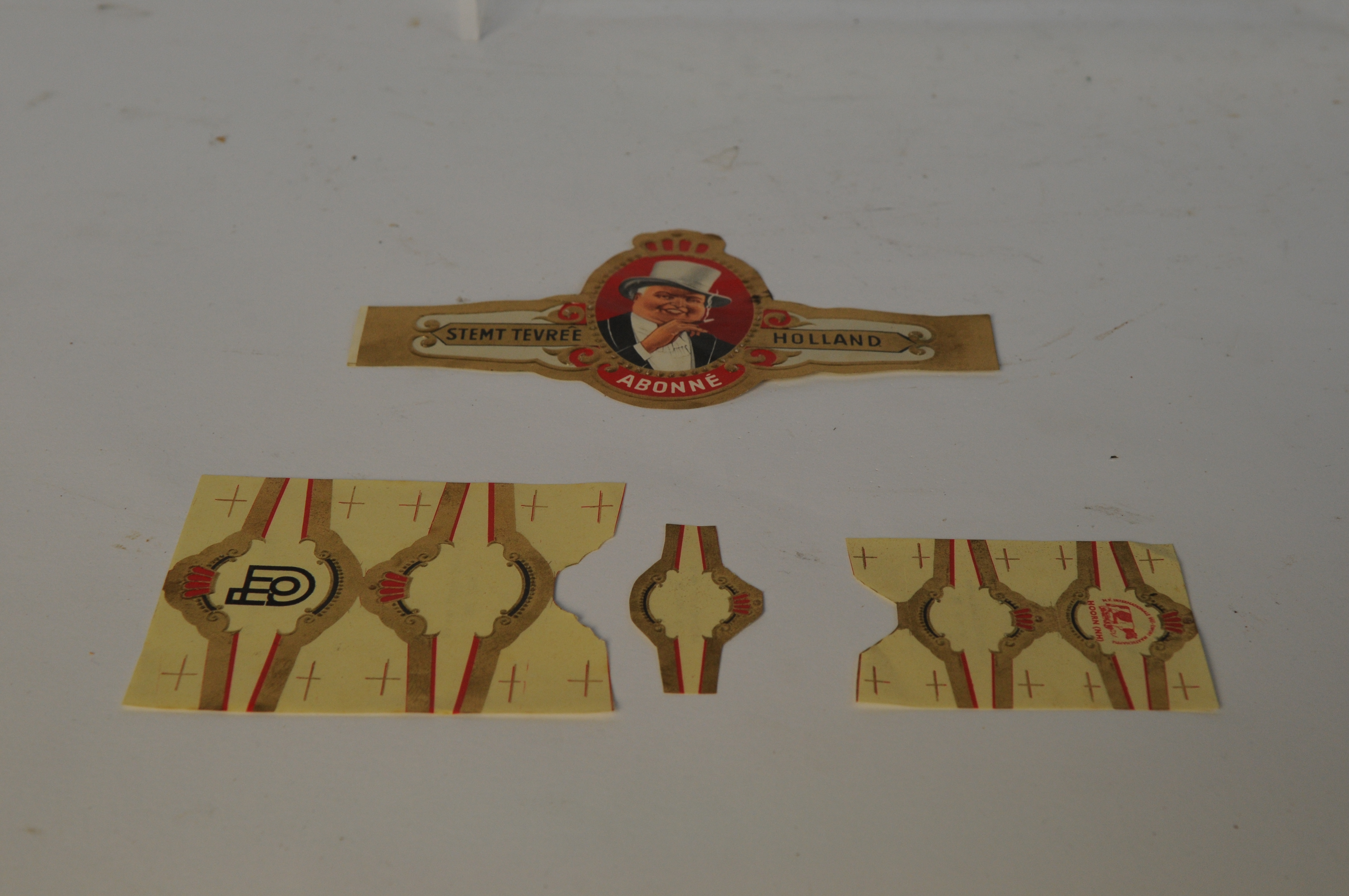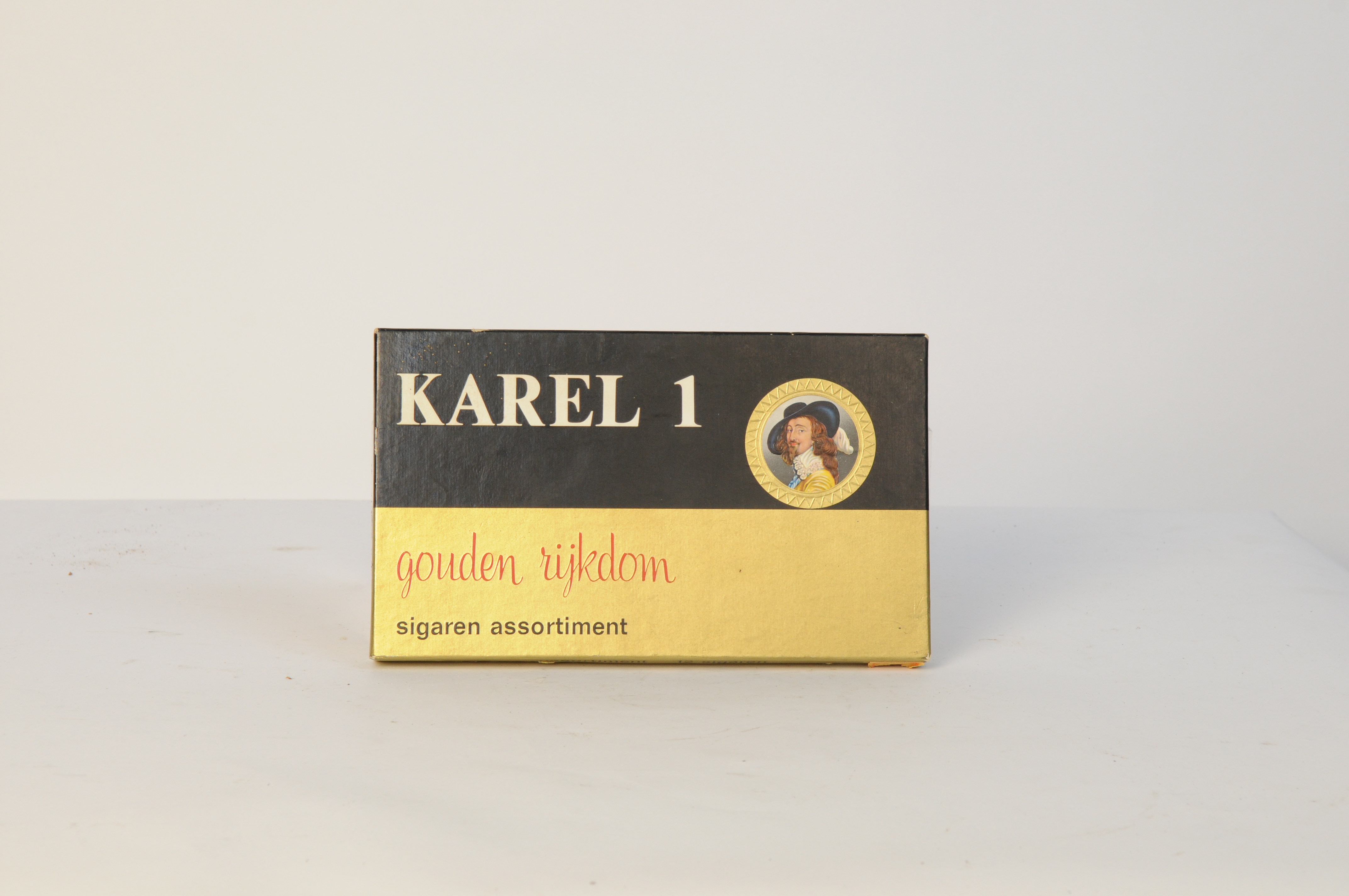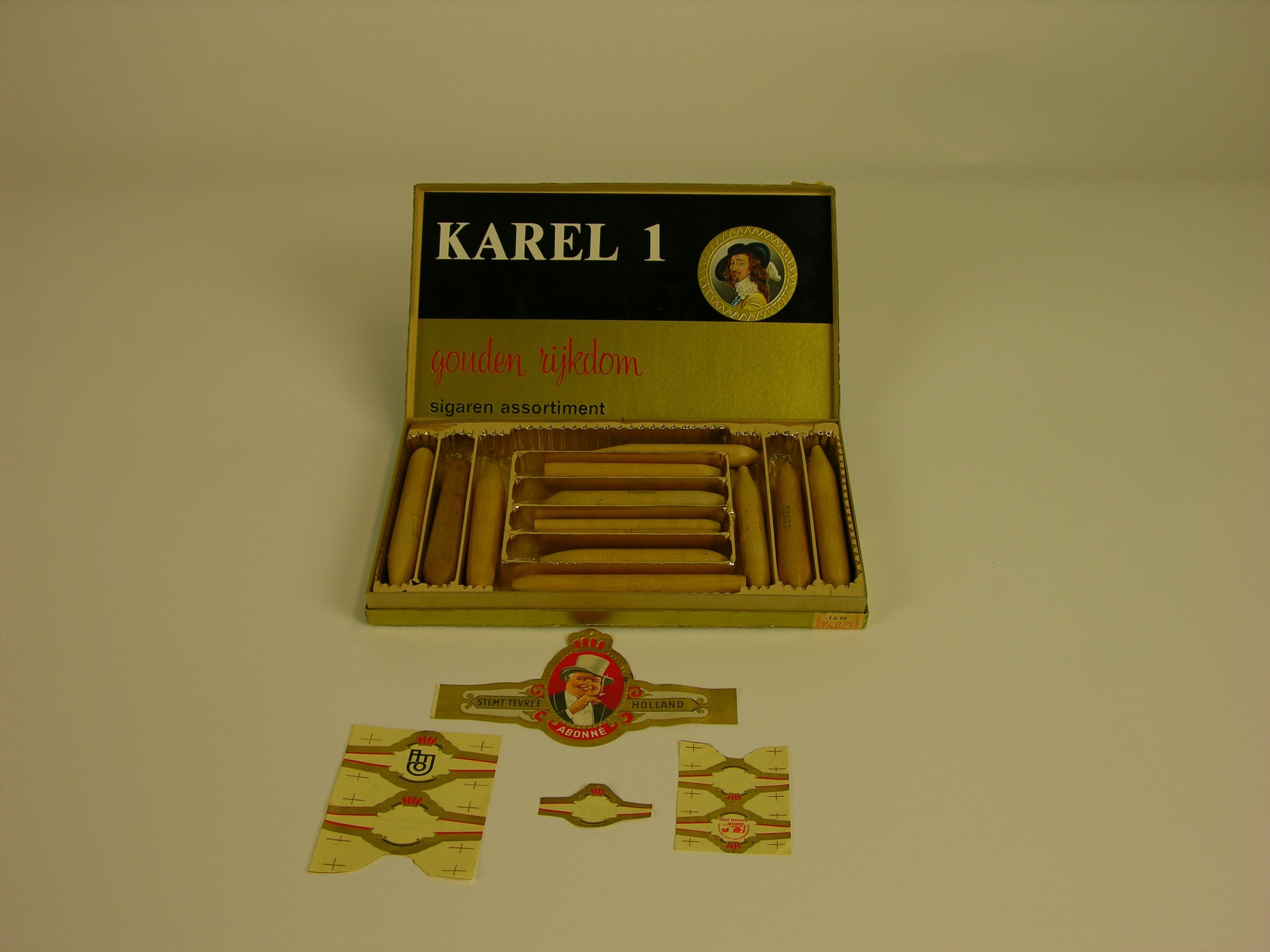 Sigarendoos Karel I Gouden Rijkdom sigarenassortiment - omstreeks jaren 1960, materiaal: karton,kleurenlithografie/papier en hout, afmetingen: 2 x 24,5 x 14,5 cm, Doosje voor 14 houten sigarenvormen tesamen het Karel I Gouden Rijkdom sigaren assortiment vormend In de doos zitten 14 houten sigaren-vormen en enkele bandjes 0.a. 'Steunt Veel van de sigarenvormen in de Karel I doos ...