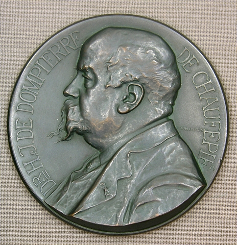 Herinneringspenning voor dr. Henri Jean de Dompierre de Chauffepié (Amsterdam 20-9-1861 - 1911 onbekend) - z.j., brons, gietpenning, 65 x 4 mm Voorzijde: portret en profil n.l. van Dr. H. Dompierre de Chauffepié. Randschrift 'Dr. H.J. DE DOMPIERRE DE CHAUFFEPIÉ'. Keerzijde: vrouwelijk halfnaakt gezeten op en deels bedekt met draperieën. Opschrift: 'NEDERL BELGISCHE VEREENIGING DER VRIENDEN ...