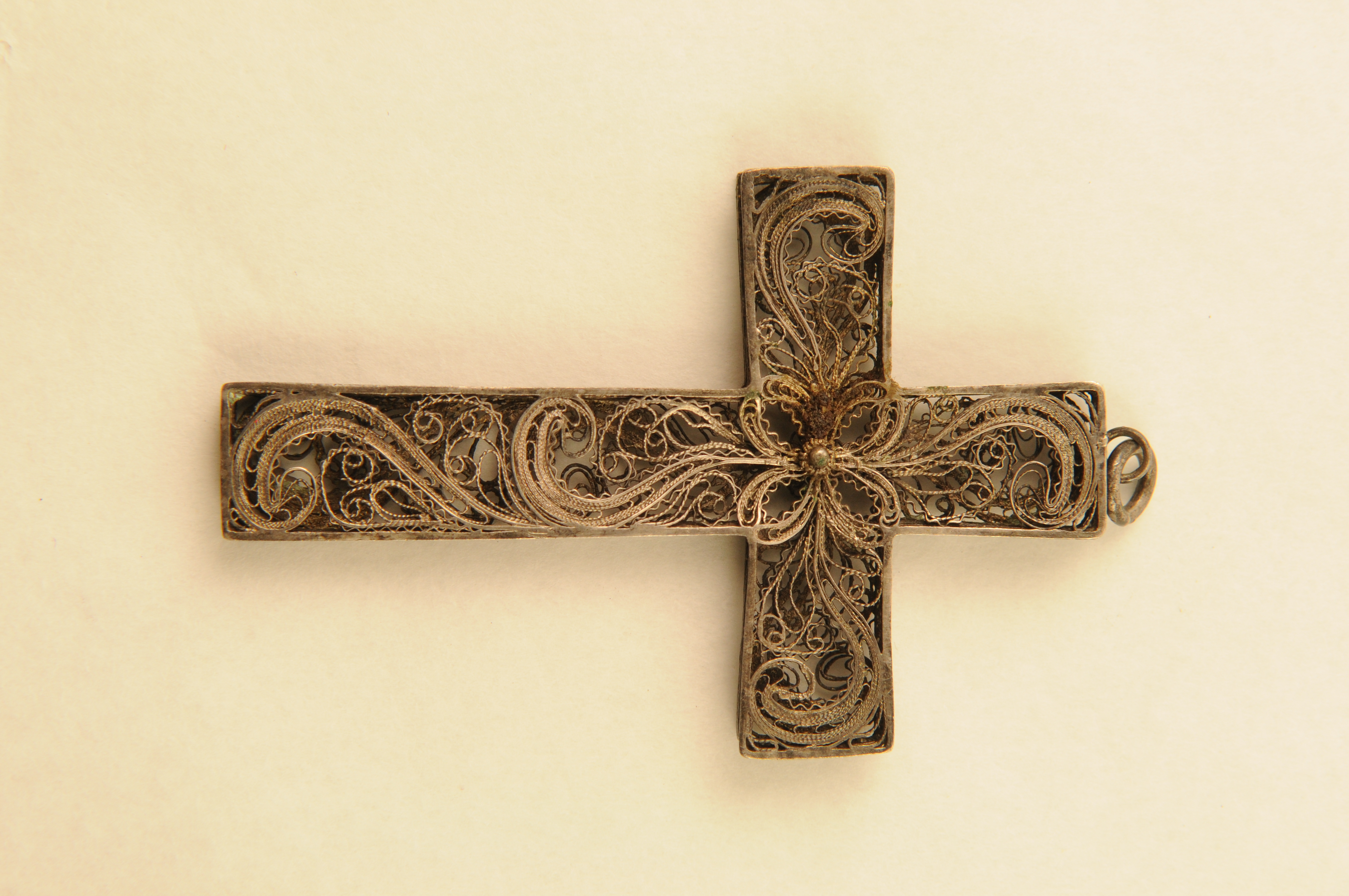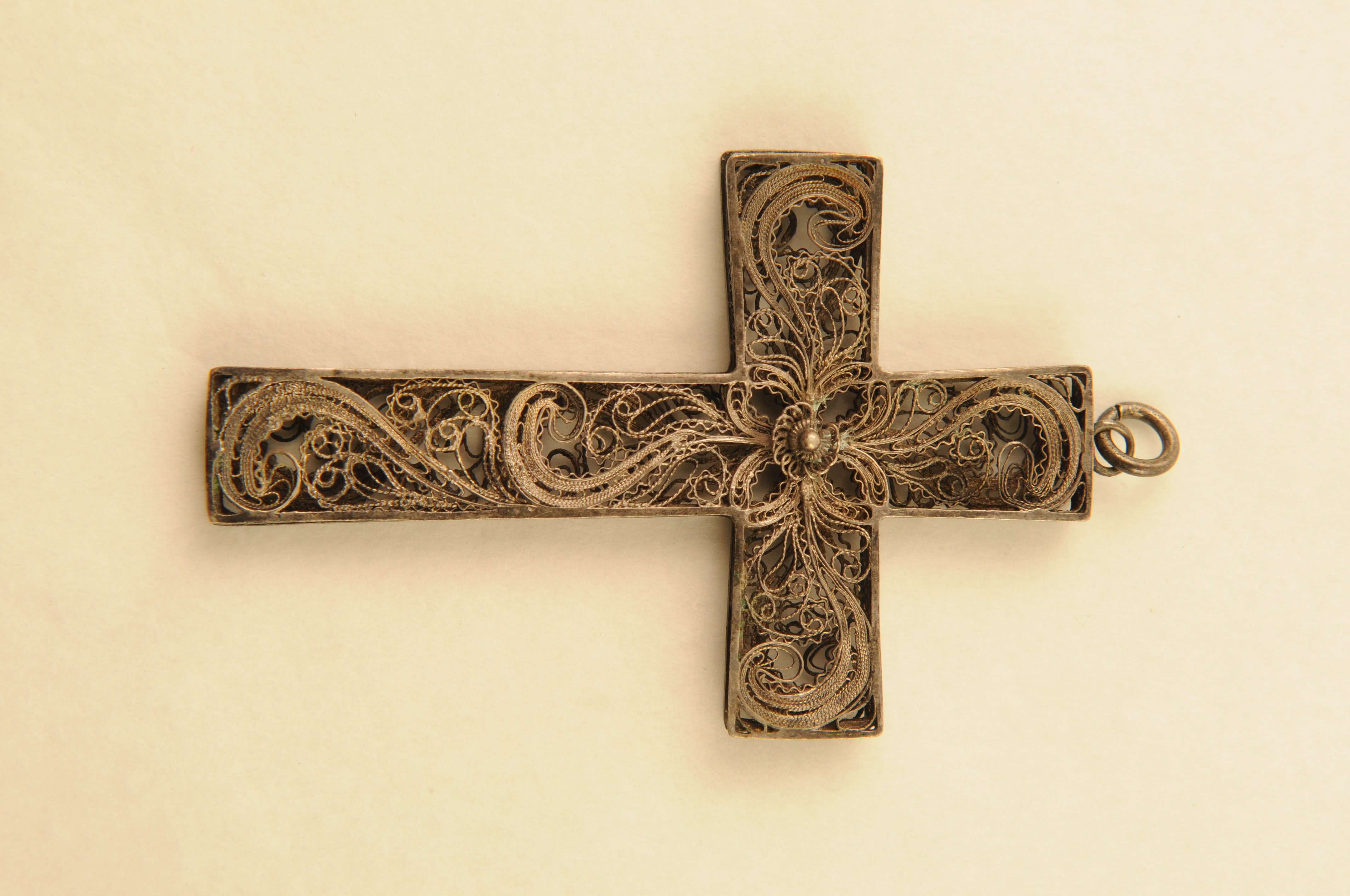 Opengewerkt hangkruis – z.j., zilver (zilverfiligrain), hangkruis met opengewerkte balken waarin zich rankmotieven van zilverfiligrain bevinden, datering 1875 – 1900, met ophangoogje en draagringetje, 8 x 4,9 x 0,4 cm