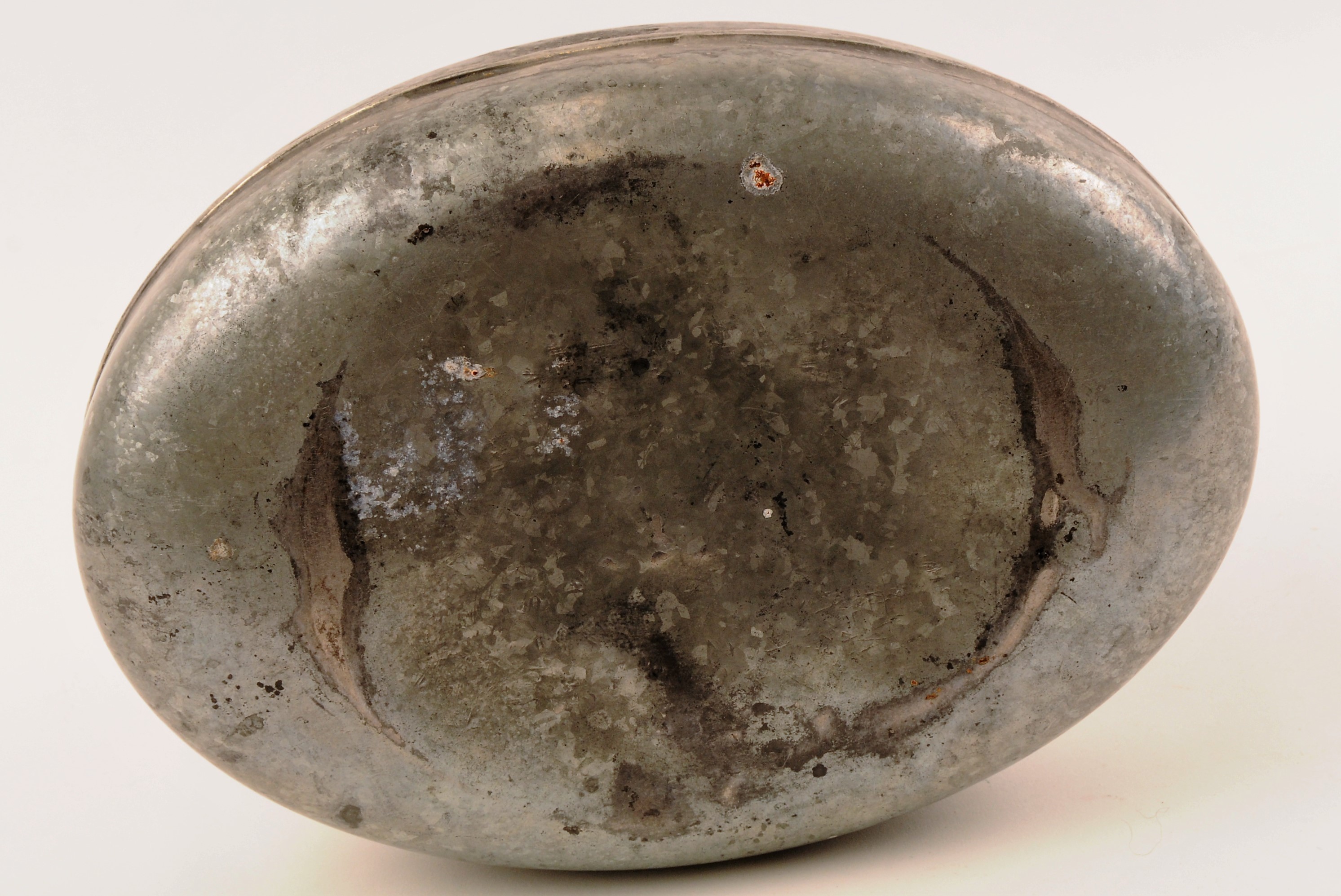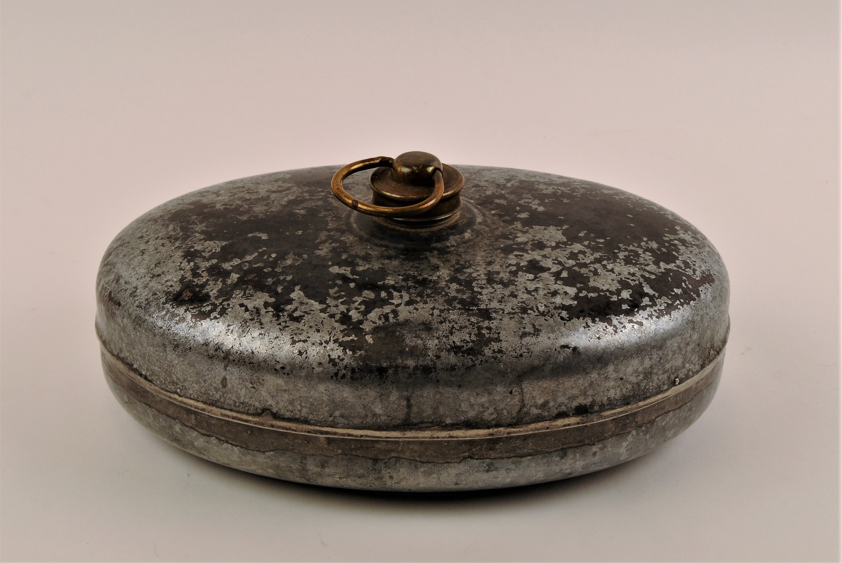 Metalen kruik met koperen schroef-sluiting met ring. Om de kruik een bijbehorende gebreide overtrek (genummerd 1989.01.04b)
