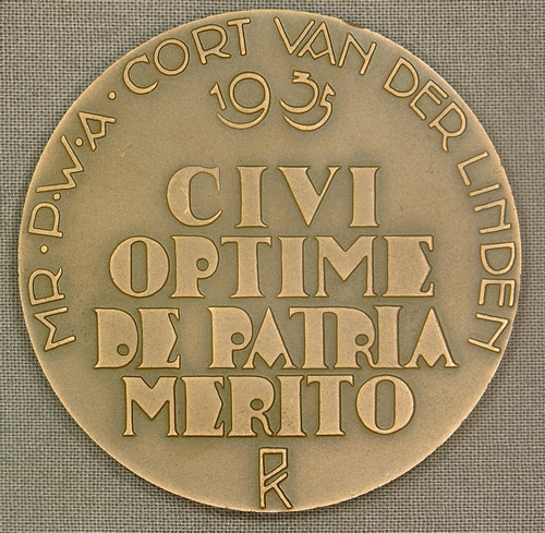 Penning “Cort van der Linden” (eerste penning van de Vereniging voor Penningkunst 1935) – Theo van Reijn 1935. Uitgevoerd door Koninklijke Begeer Voorschoten. Slagpenning, brons, diameter 60 mm, randdikte 3 mm. Voorzijde: Portretbuste van Cort van der Linden n.l. schuin van boven gezien. Keerzijde: Opschrift in art Deco-belettering “CIVI OPTIME DE PATRIA MERITO”, randschrift “MR. ...
