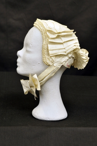 Kovel (rouw), materiaal: katoen, kleur: , lengte 32 cm, breedte 45 cm, drie rijen toerkes, plat stuk in model gevouwen, zes lussen aan de kant, lange mutsenlinten 53 cm, 7 cm x 7,5 cm stukje broderiekant aan uiteinden, rode initialen W.W. Bossche muts uit Bladel, vervaardigd door mevrouw v.d. Leest te Bladel