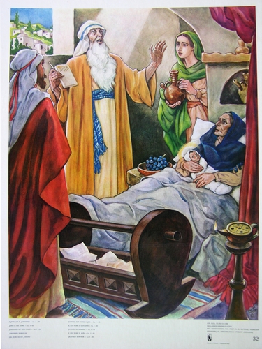 Schoolplaat 'Geboorte van Sint Jan', voorstelling van de geboorte van Johannes de Doper. Bellarminus Bijbelplaten-serie no.32, gesigneerd in voorstelling r.o.: Frans van Noorden, onder de voorstelling het opschrift: Zijn naam is Johannes (Lucas 1: 63) app. eccl. Ultr. 13-1-1954