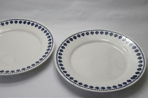 Ontbijtbord/dessertbord - 1e kwart 20e eeuw, aardewerk/geglazuurd, kleur: blauw op wit fond, afmetingen: hoogte 2,5 cm, diameter 21 cm, witbakkend aardewerk met blauwe versiering en glazuur; versiering in de vorm van blauwe ruitvormen en ineengeschoven v-vormen langs de rand, op onderzijde het firma-stempel 'WITTENBERG' met een in vier kwadranten gedeeld wapen en de letter H Onderdeel ...