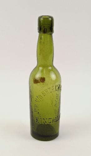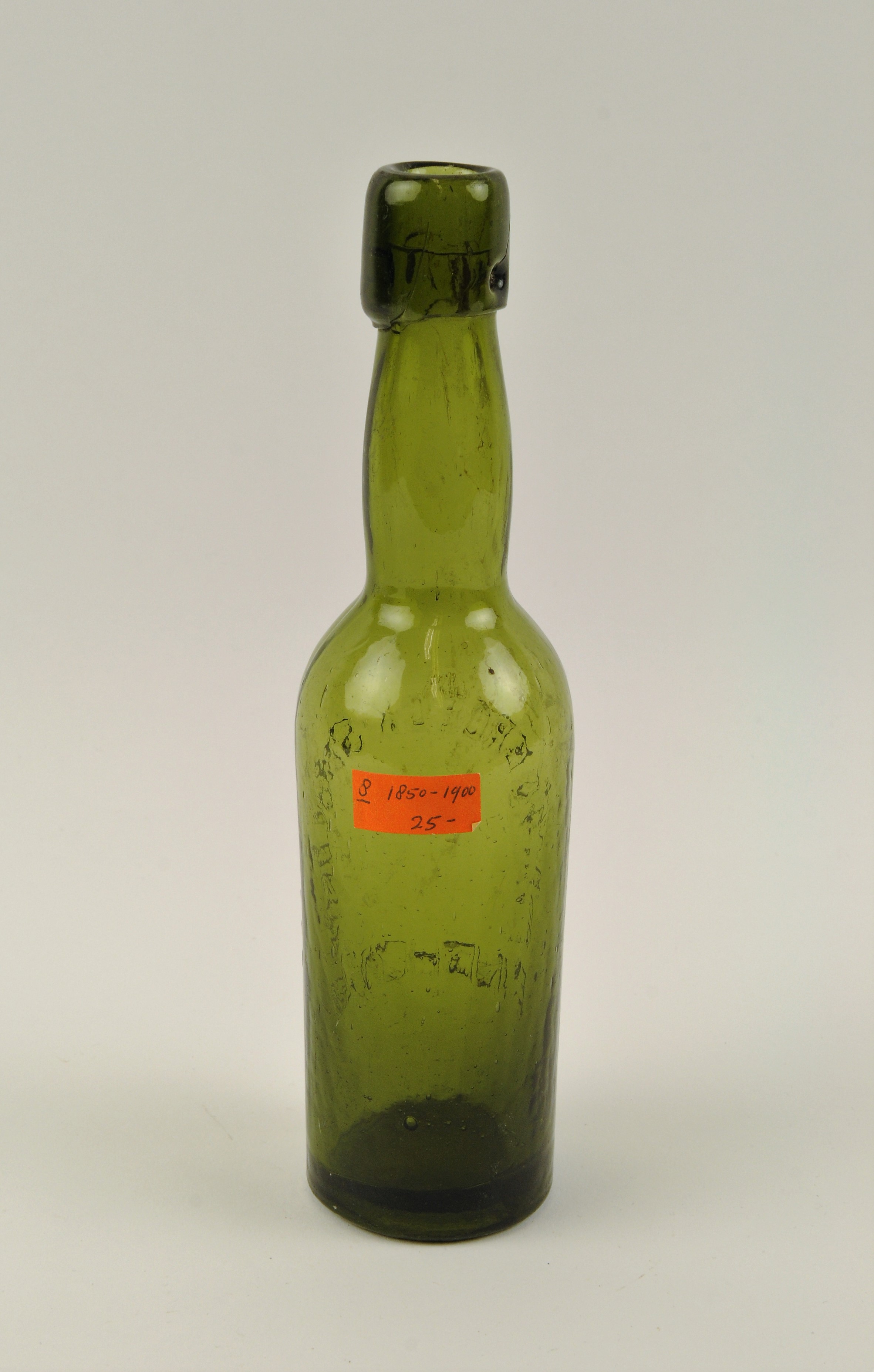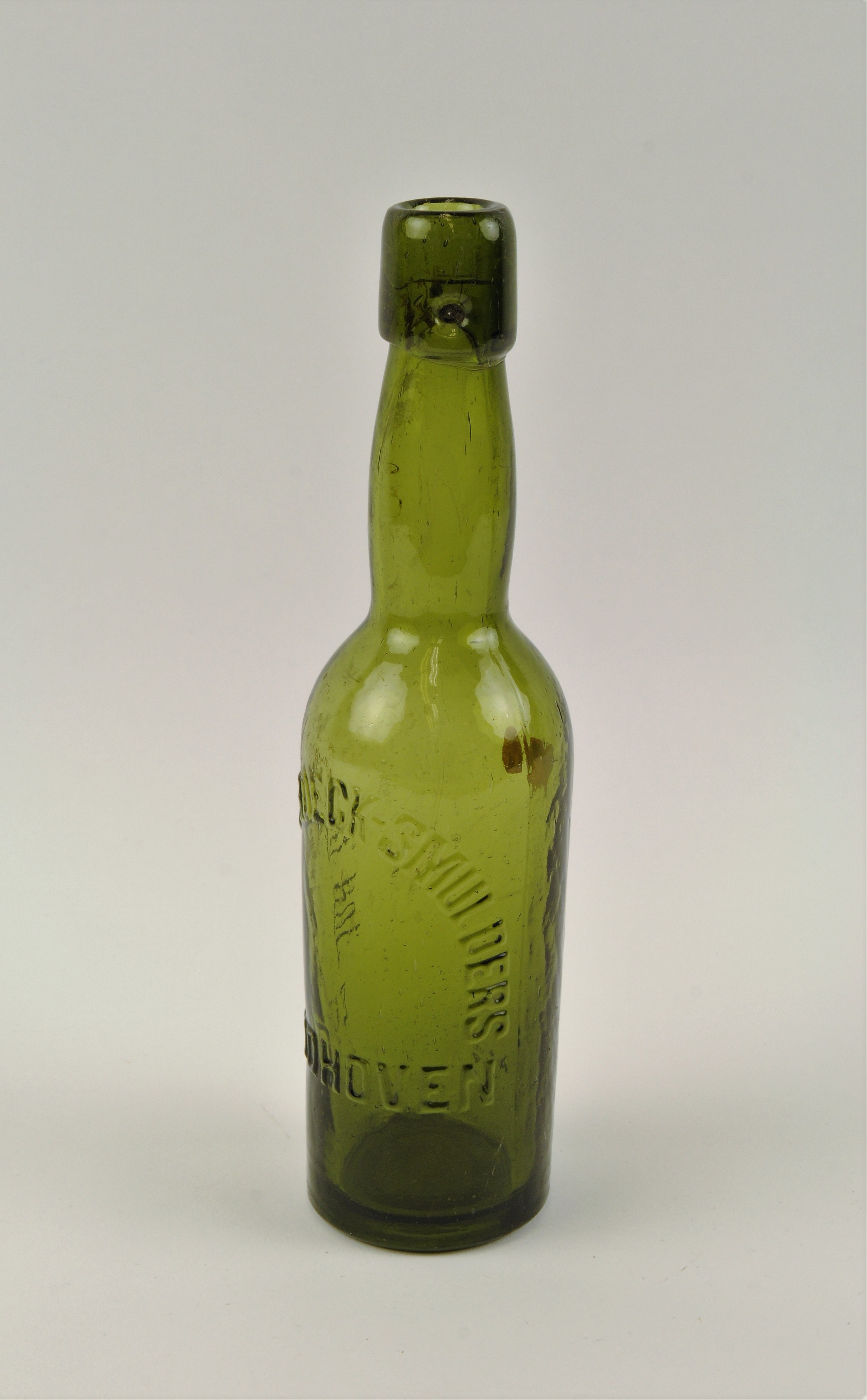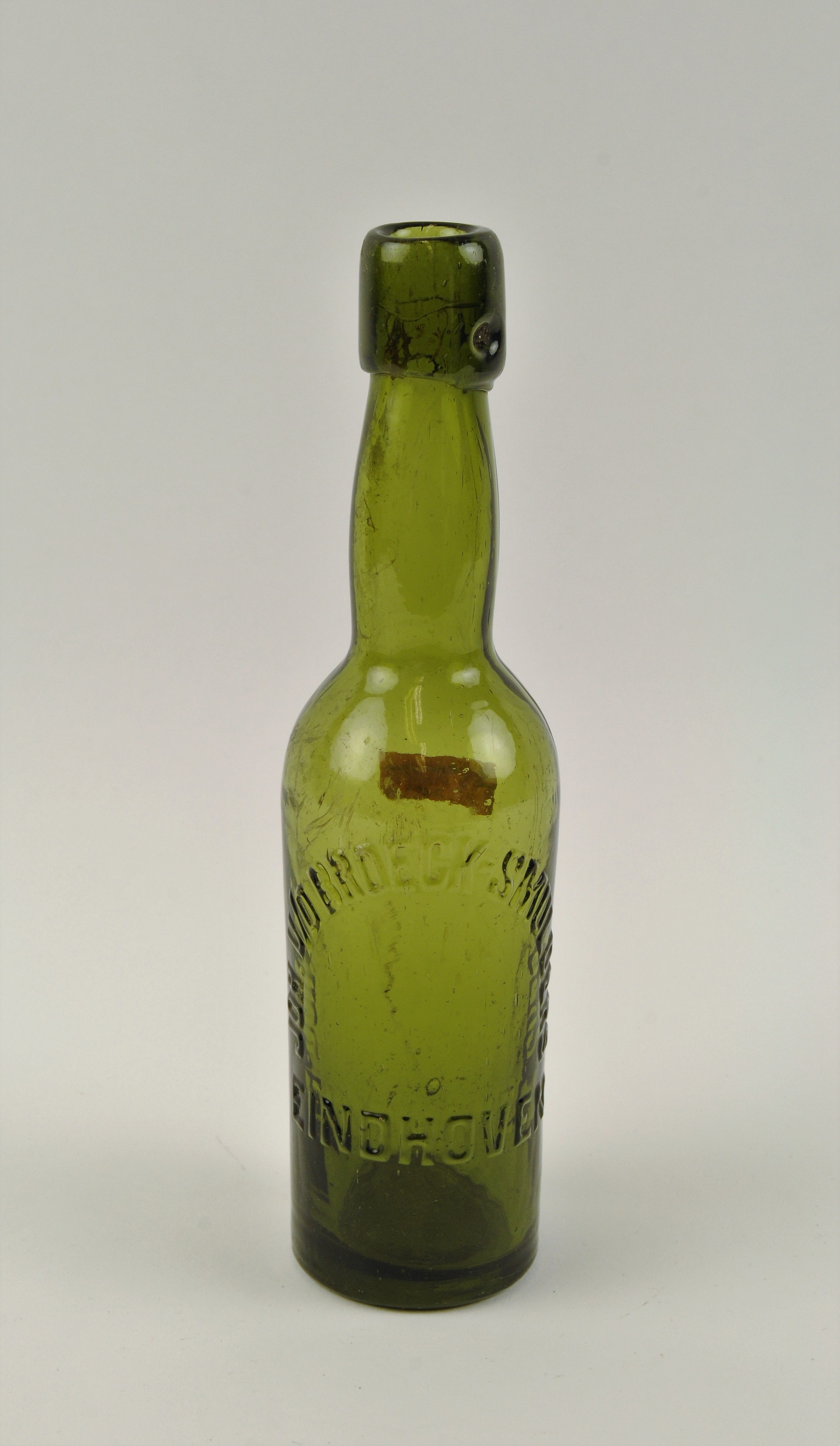 Bierfles- eind 1850-1900, materiaal: glas, kleur: lichtgroen, afmetingen: 255 x 6.5 cm, tekst in glas "Joh. v.d Broeck Smulders Eindhoven" Wijnfles - eind 19e/begin 20e eeuw, materiaal: glas, kleur: lichtgroen, afmetingen: 28,5 x 6 cm, wijnfles met naar binnen 'ingedrukte' bodem. Oud inv. nr. s.n.600, etiket: 14 1850-1900 35,-