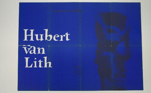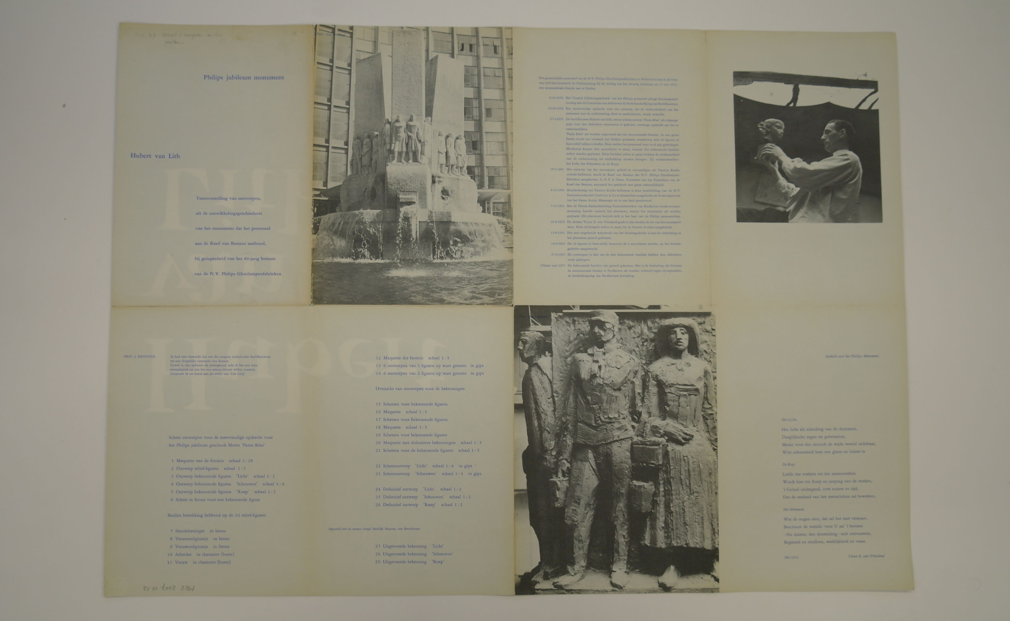 Tentoonstellingsaffiche van een tentoonstelling over het Philips Jubileum Monument gehouden in het Stedelijk Museum te Amsterdam van 1 juni tot 1 juli 1957 – 1957, offsettdruk/papier, 50,5 x 70,5 cm, met op de voorzijde tegen een donkerblauwe achtergrond een afbeelding van een detail van het Philips Jubileum Monument, de teksten ‘Hubert van Lith’, ‘monument Philips’ ...