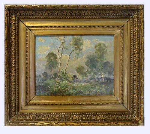 Kempisch landschap met berkenbomen – ca. 1910, olieverf/doek, gesigneerd l.o.: V. De Buck, afm. 27 x 34 cm Dit doek is afkomstig uit het bezit van de Fam. Ed. Claessen, sigarenfabrikanten te Hapert. De schenker is de weduwnaar van een dochter uit deze familie, woonachtig in Bladel