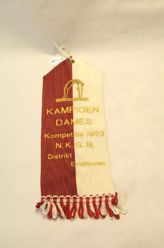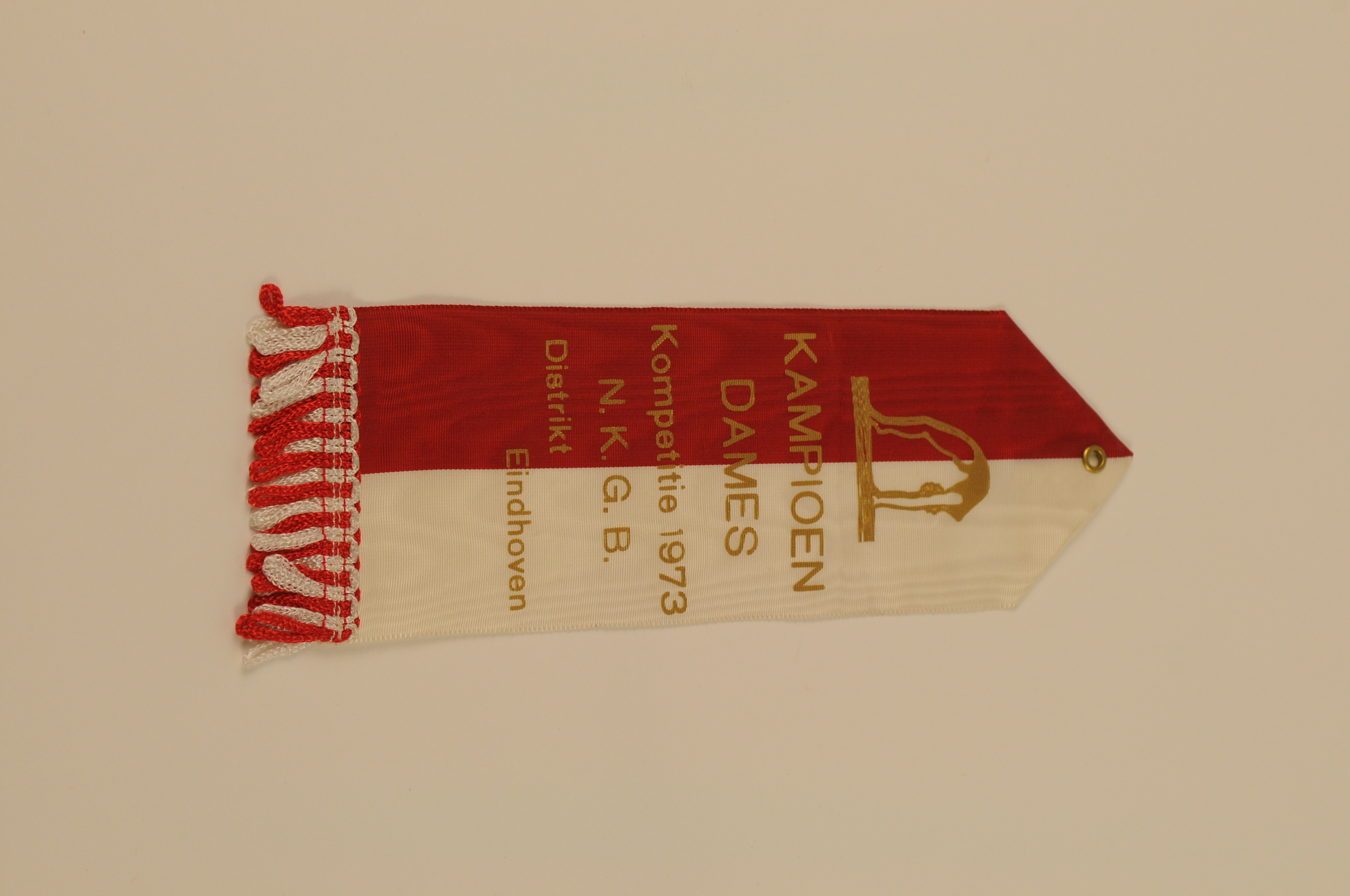 Vaantje Districtkampioenschap Dames NKGB – 1973, materiaal: nylon, kleur: rood/wit/goudkleurig, afmetingen: 24,5 x 7,5 cm, roodwit verticaal gebaand vaantje met in vergulde letters de opdruk: ‘KAMPIOEN DAMES KOMPETITIE 1973 N.K.G.B. DISTRICT EINDHOVEN’ en vergulde opdruk met in handstand achterover gebogen turnster