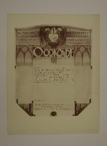 Oorkonde, huisgezin plechtig ingewijd. Drukwerk in bruin/goudop papier