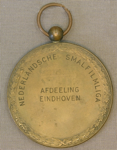 Prijsmedaille, materiaal: messing, vz. reliëfafbeelding van een Victoria met lauwerkrans en palmtak rechts van teksteveld met inschrift ‘2e PRIJS INTERNE WEDSTRIJD OCTOBER 1932’, kz. op rand een doorlopend lauwerkransmotief met daarbinnen het rand-inschrift ‘NEDERLANSCHE SMALFILMLIGA’ en op het centrale tekstveld het inschrift ‘AFDEELING EINDHOVEN’, met doorboord knopje en draagringetje, 8 x 6 x 0,2 cm
