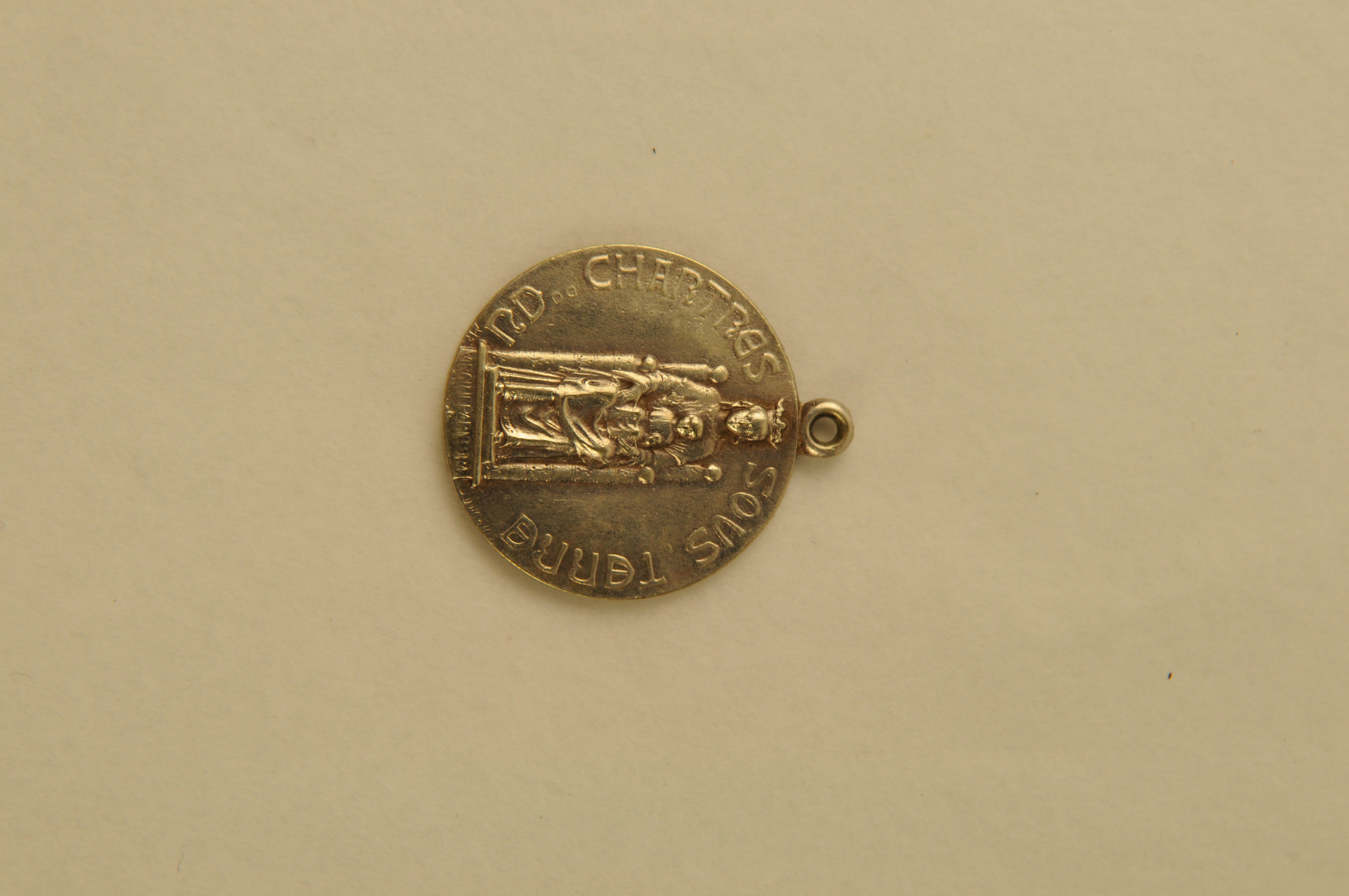 Religieuze medaille/draagpenning, rond, materiaal:metaal/verzilverd, vz. beeld van de N.D. van Chartres op zuil met mantel en randschrift ‘ND de CHARTRES PRIEZ POUR NOUS’, kz. beeld van de N.D. de Chartres Sous Terre en randschrift ‘ND de CHARTRES SOUS TERRE’, 3,5 x 3 cm