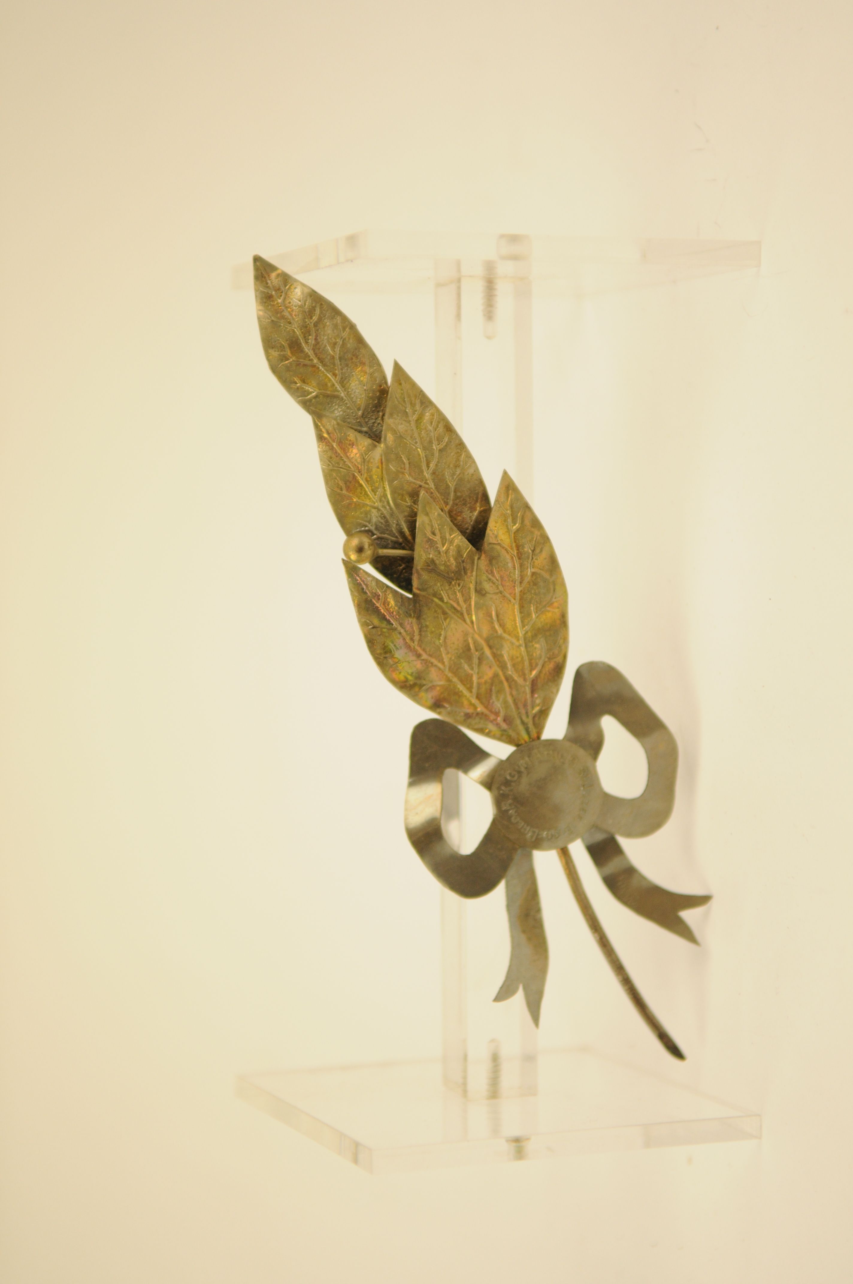 Lauwertak – z.j., materiaal: metaal, verguld en verzilverd, afmetingen: 15,5 x 5 x 1 cm, zesbladige lauwertak met één vrucht en symmetrisch uitgewerkt banderole-lint met centraal medaillon met inscriptie: ‘R.K. Gym. Athl. B. St. Jozef Bisdom Breda’