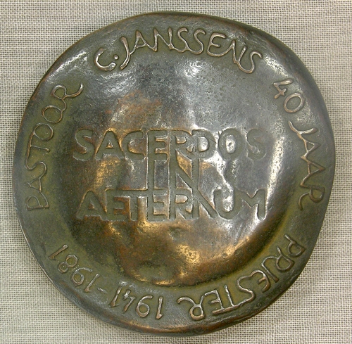 Jubileumpenning 40-jarig priesterschap pastoor Janssens - 1981, brons, diam. 61 mm, dikte 14 mm, recto: portret pastoor Janssens naar rechts, verso: ´PASTOOR C. JANSSENS 40 JAAR PRIESTER 1941-1981´, opschrift: ´SACERDOS IN AETERNUM´, gemonogrammeerd vz.: JR (ineen) Penning eveneens b.g.v. ereburgerschap van de gemeente Helmond