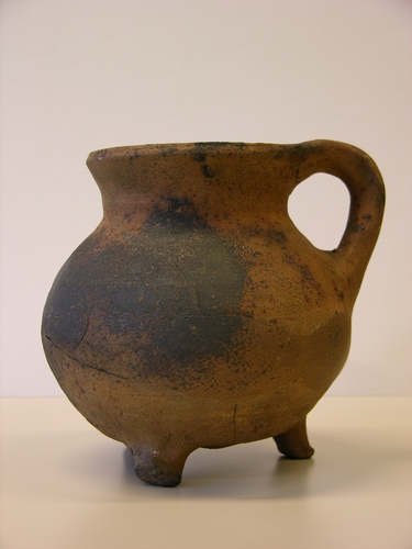 Klein roodbakkend kookpotje op drie pootjes met 1 worstoortje en een opstaande rand. Glazuur op het buitenoppervlak is grotendeels verbrand, dit geldt ook voor het glazuur op de bodem. Tertiaire klei, 16e eeuws Qua datering en typologie zou dit potje thuis kunnen horen op Gagelbosch of Kasteel van Eindhoven, alleen ontbreekt een opgravingscode op het object ...