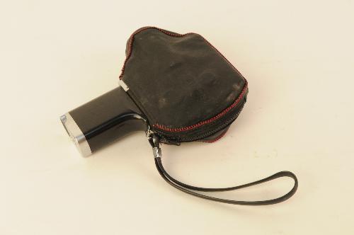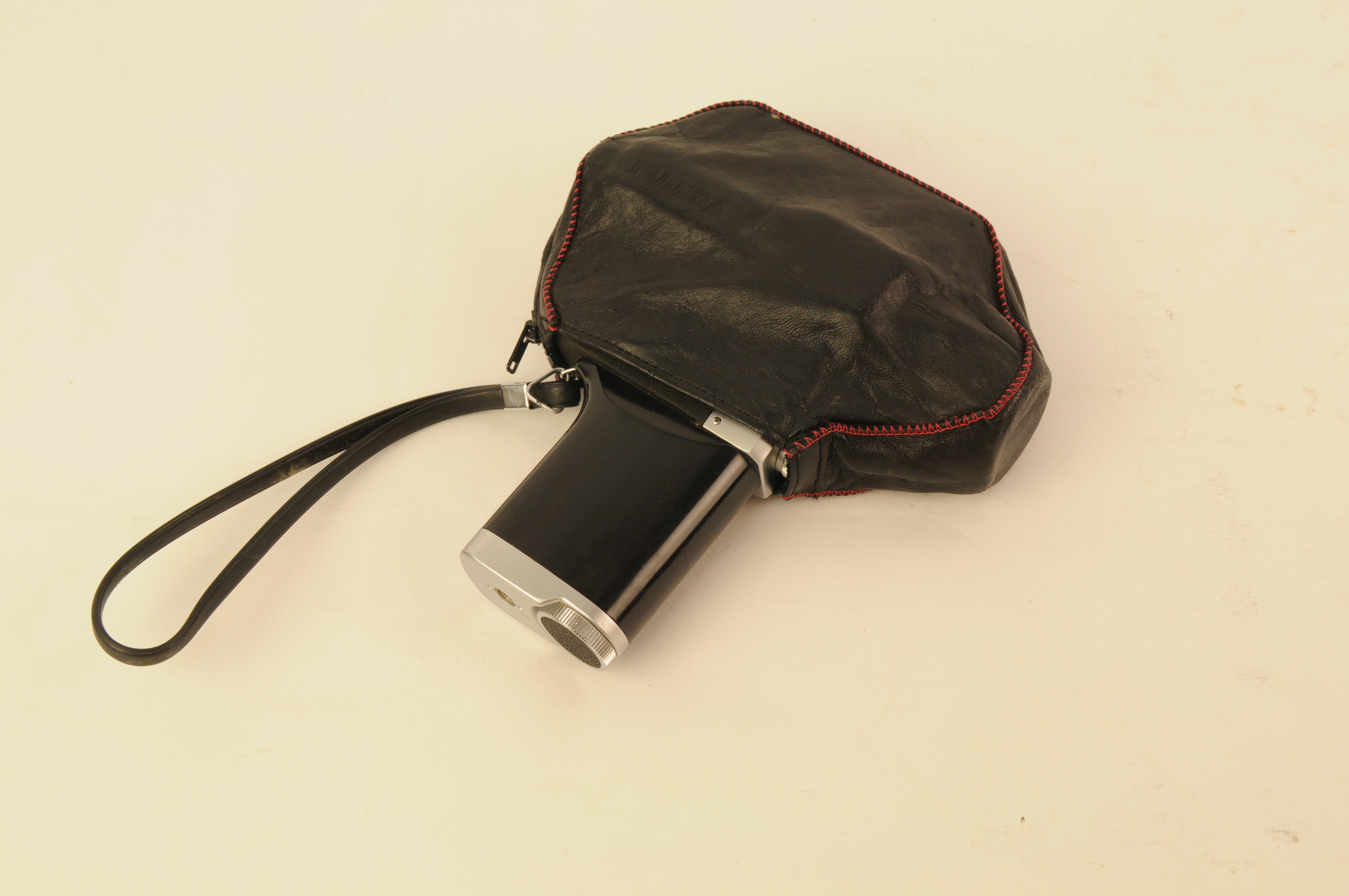 Fujica filmcamera in lederen beschermtasje. Fujica Single-8 P 300, Made in Germany, Fujinan zoom-lens