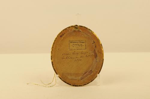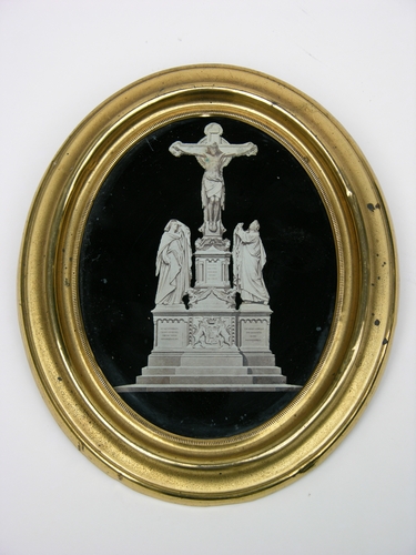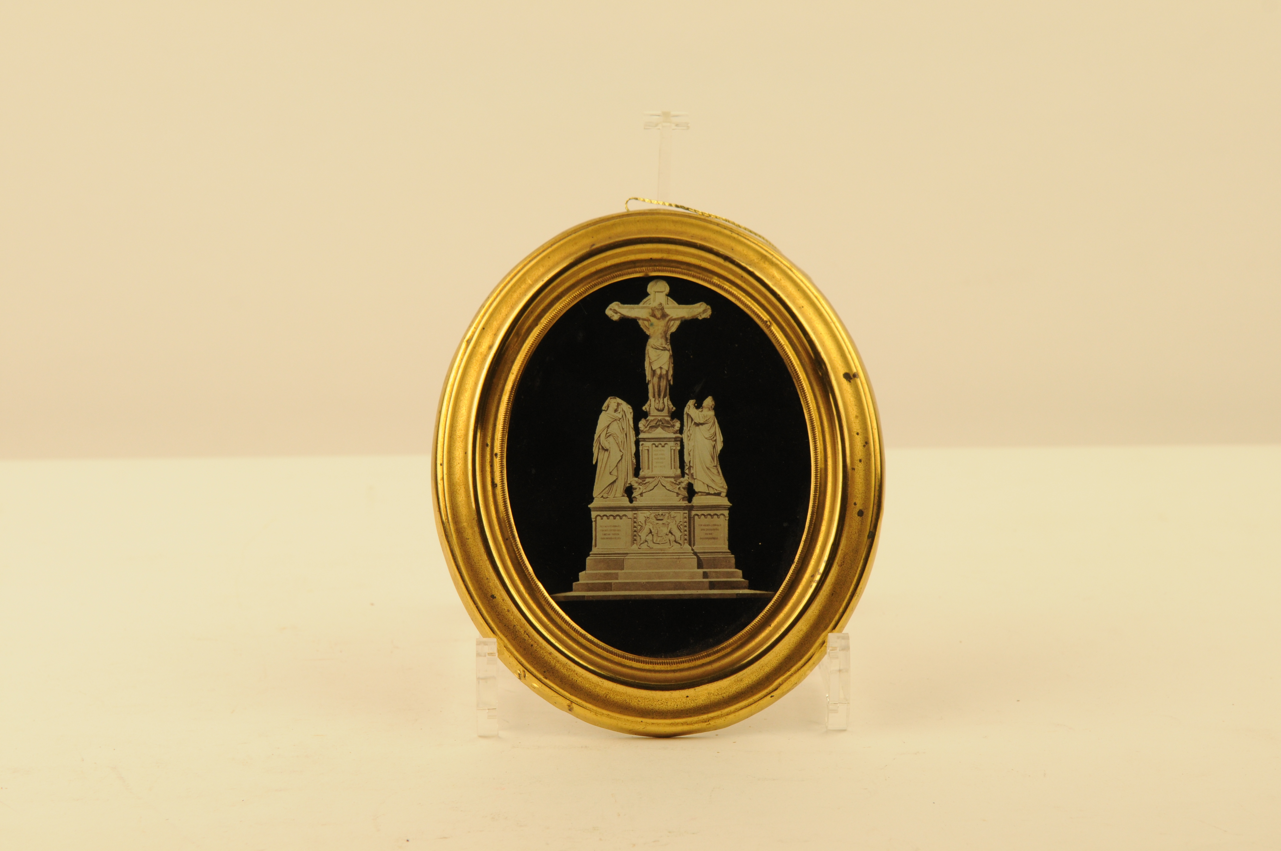 ovaal medaillon met achter vlak ovaal glas in verguld houten lijst een fotografische voorstelling van de kruisigingsgroep uit Oberammergau, opgericht door Koning Ludwig II van Beieren in 1875 op a.z.: Dezen berg heeft Jan Pessers beklommen d'n 3 september 1890