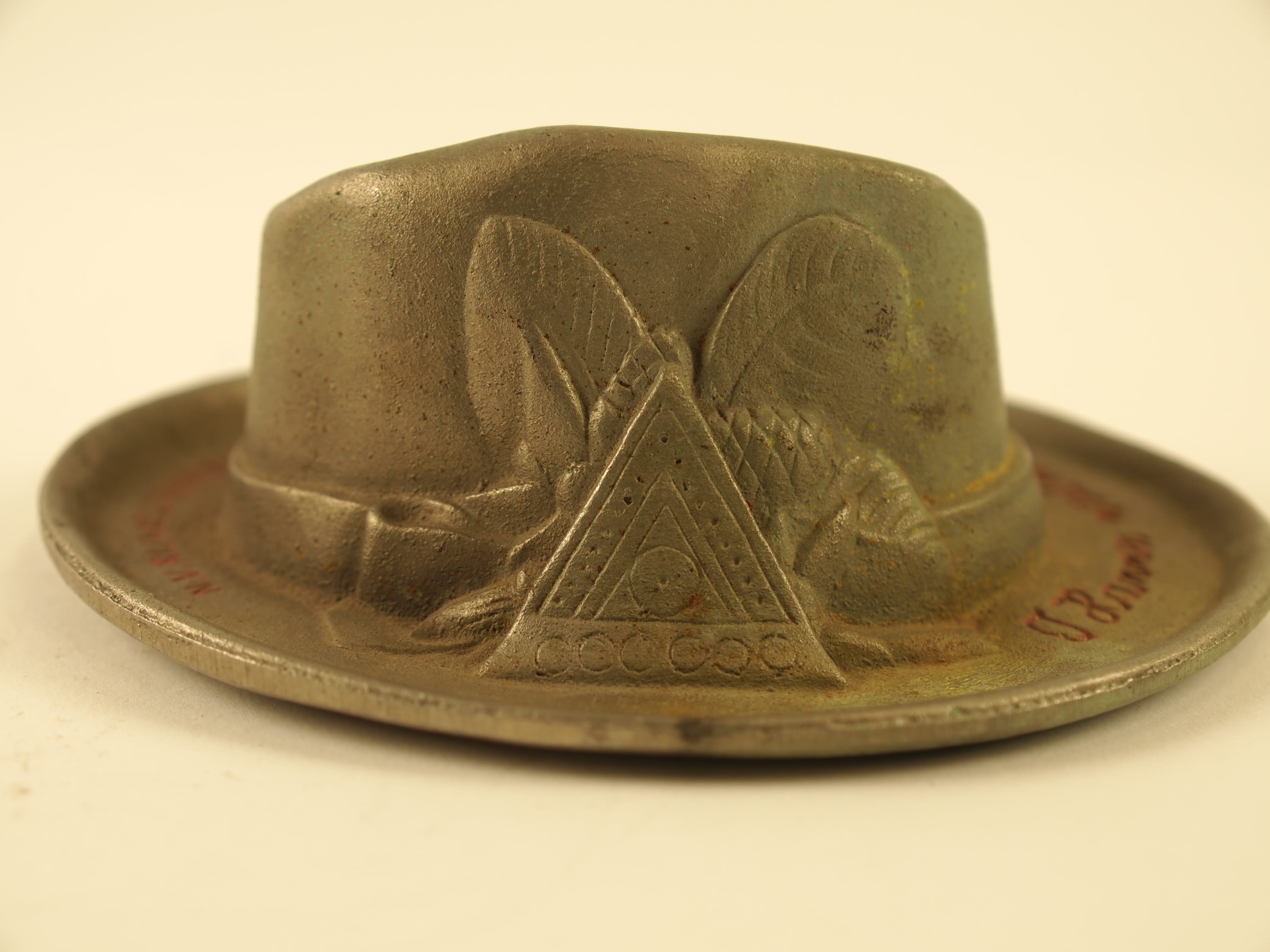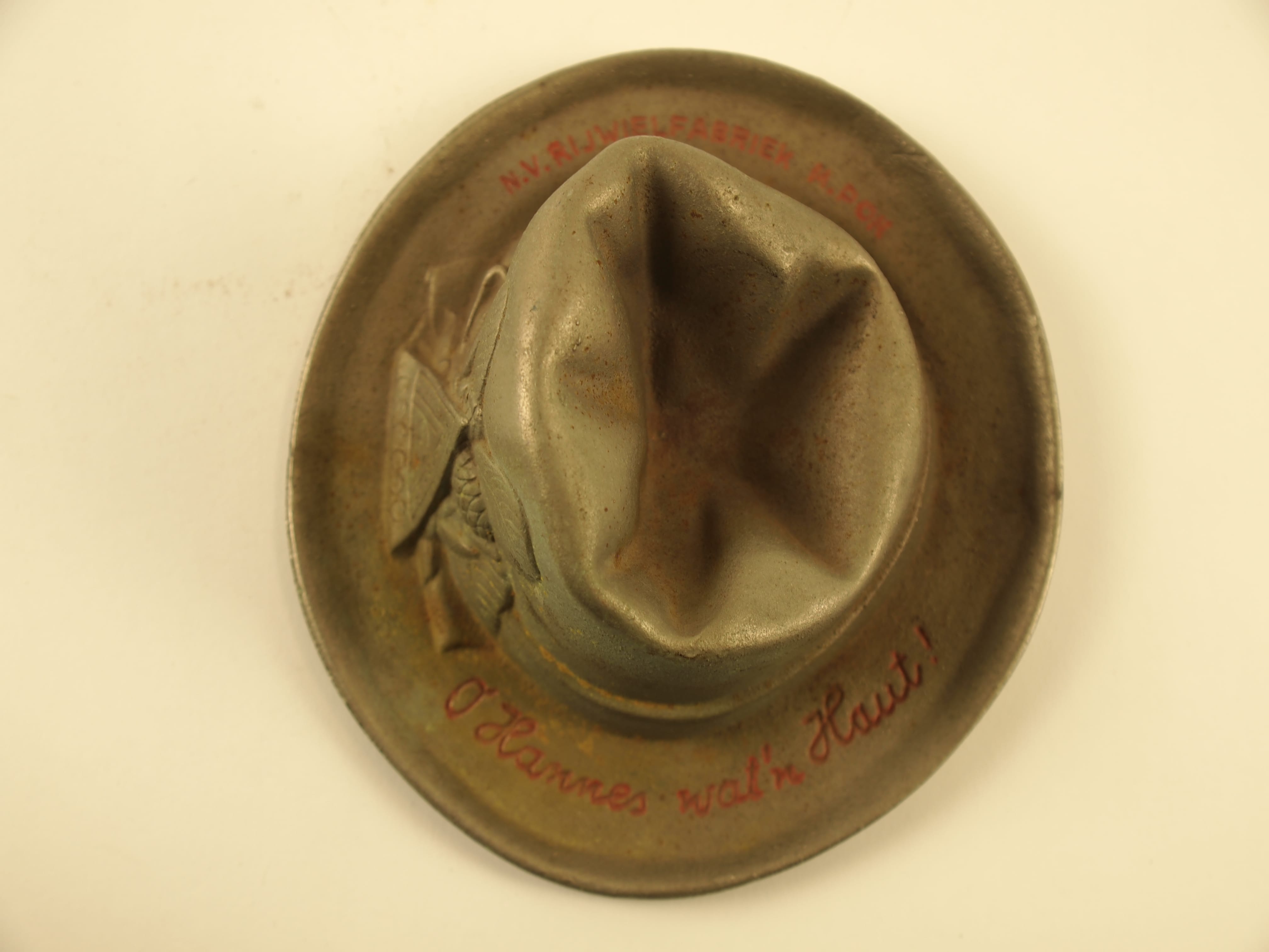 Ingedeukte metalen hoed in miniatuur. In de hoedrand de omlopende tekst 'N.V. Rijwielfabriek M. Pon, O Hannes wat 'n hout !'