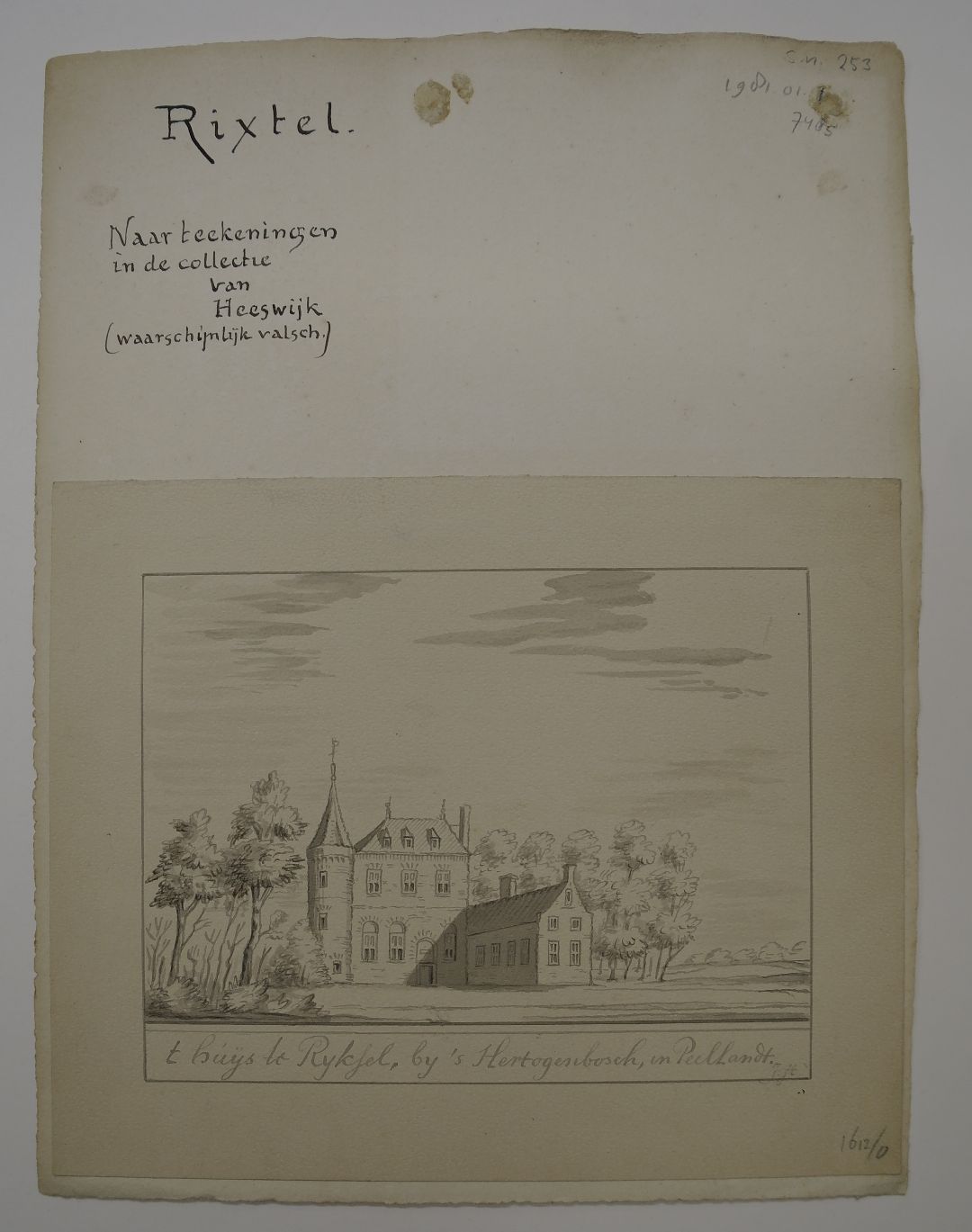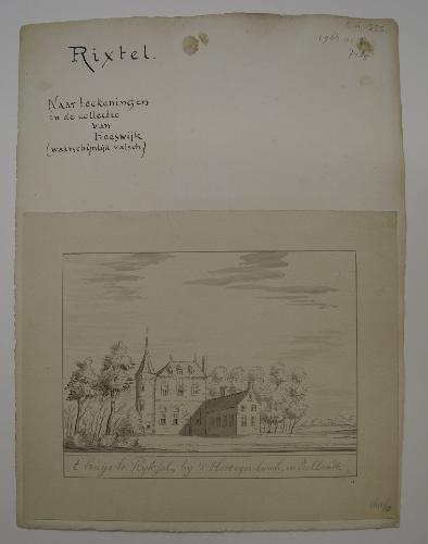 op papieren ondergrond geplakt met l.b. in O.I.-inkt de annotatie: Rixtel. naar teekeningen in de collectie van Heeswijk (waarschijnlijk valsch.) geannoteerd in gewassen inkt onder voorstelling: t huijs te Ryksel, by 's Hertogenbosch, in Peellandt. gemonogrammeerd in potlood r.o.: J:ft in potlood r.o. het (collectie)nummer 1612/0