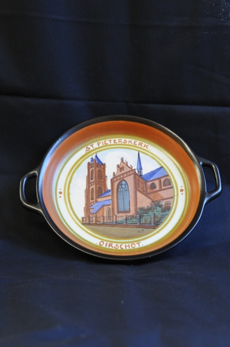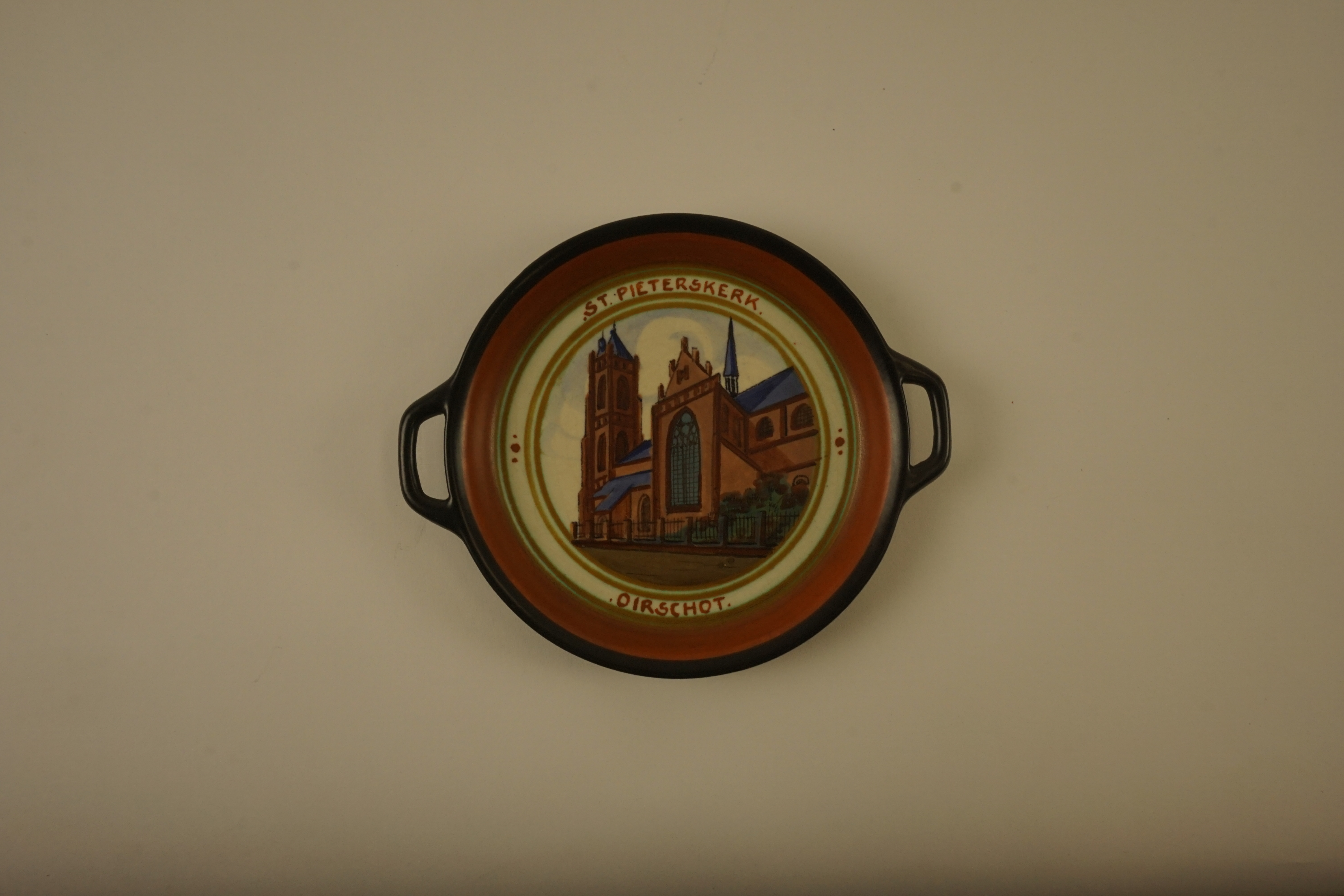 Schaaltje van mat-geglazuurd aardewerk met daarop een voorstelling van de St. Pieterskerk te Oirschot in bruin, blauw en mengkleuren. aan weerszijden tegenover elkaar een oor-greep. Op bodem onderzijde: 'Zenith Gouda Holland' en het ingekraste nummer '3' + merkteken. Oren en opstaande rand buitenzijde zwart geverfd.
