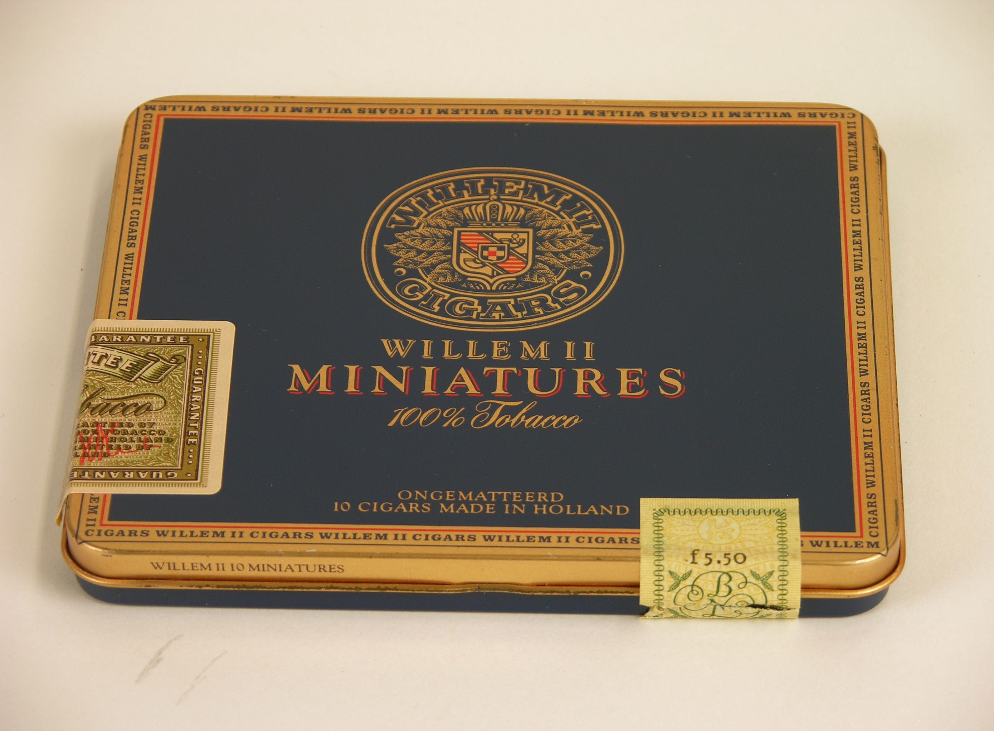 Sigarendoosje Willem II Miniatures - 2e helft van de 20e eeuw, materiaal: blik, afmetingen: 0,7 x 12,5 x 11 cm, sigarendoosje voor 10 Willem II Minatures sigaren, met opdruk 'Willem II Miniatures 100% Tobacco, blauw en goudkleurig