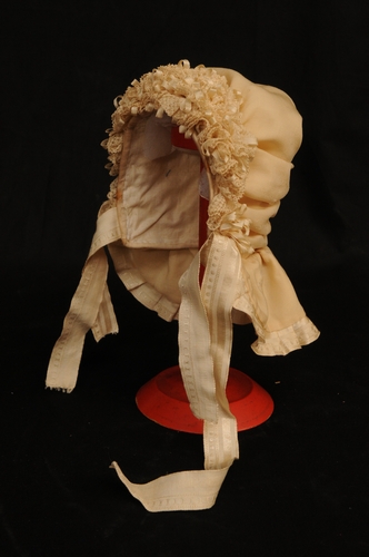 kleur: ecru Wollen mausseline, achter op het hoofd plooien afgezet met lint, voorkant met lint (in inventarislijst DM 6)