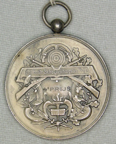 Ronde prijspenning Burgerwacht Maarheeze - 1922, materiaal: zilverlegering, afmetingen: 5,2 x 4 x 0,2 cm, vz.: inscriptie: ´MAARHEEZER BURGERWACHT AUG.'22´, boven de cartouche gekroond wapen met staande, naar links gewende leeuwfiguur, links en rechts daarvan bladertakken. Geheel onderaan leeg cartouche met aan weerszijden een monogram (met loep bekijken... B E (S?) K ?). kz.: banderole ...