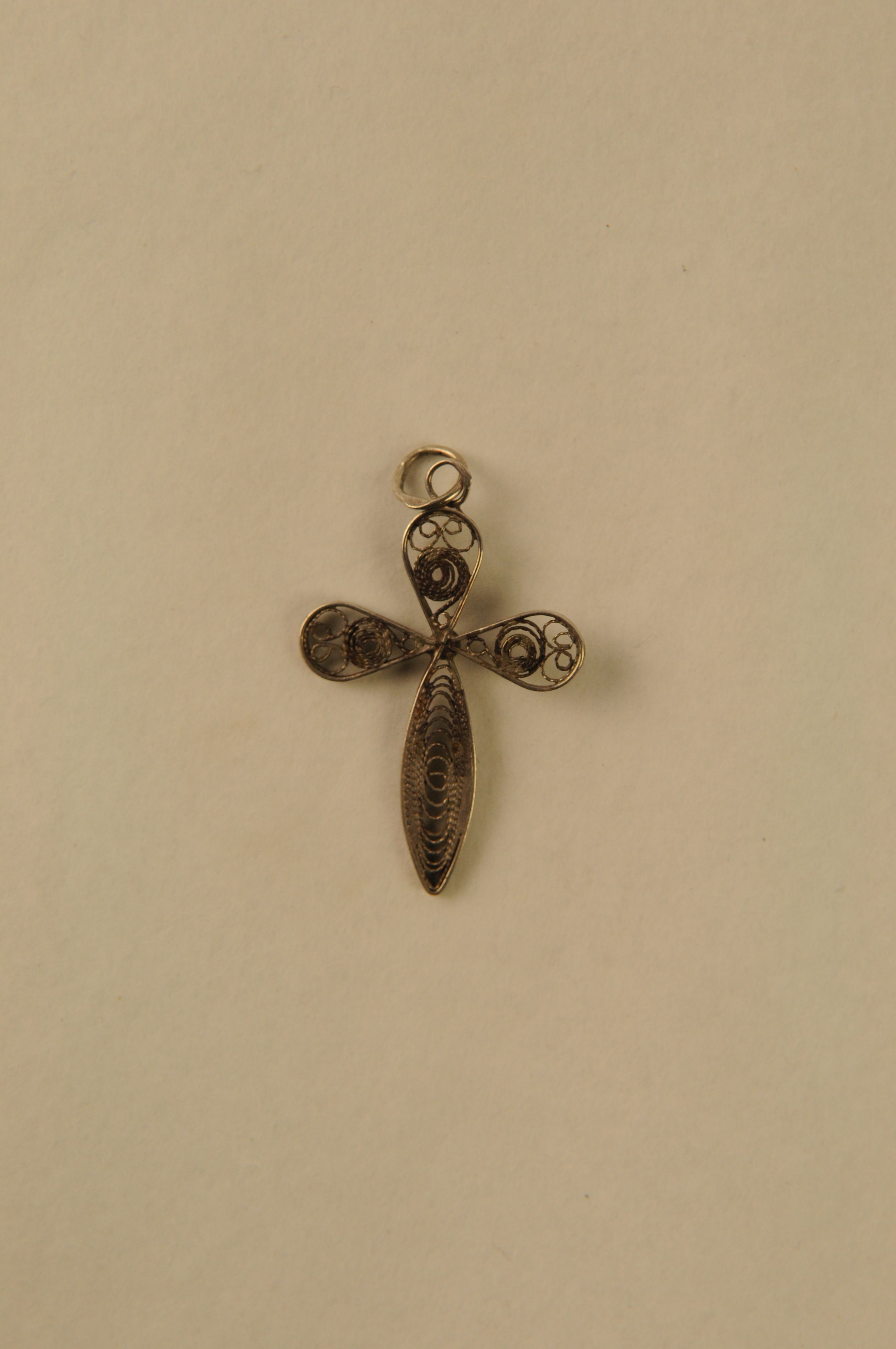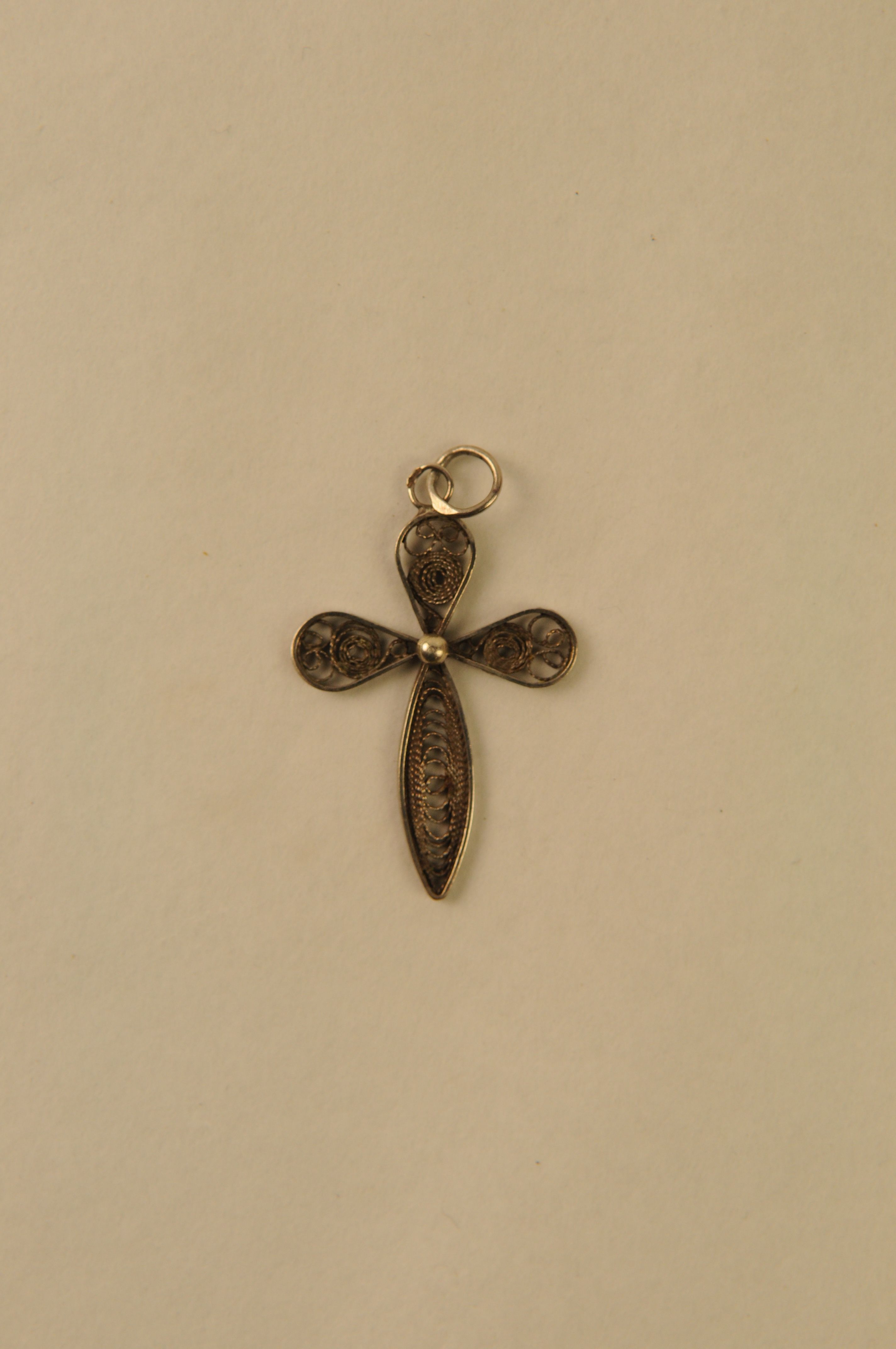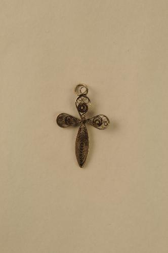 Hangkruis, zilver, kruisbalken gevuld met gerold zilverfiligrain en zilveren knopje op middelpunt van de kruisbalken, 4,3 x 2,5 x 0,1 cm