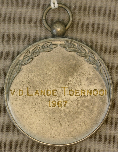 Ronde sportmedaille/draagpenning met een ophangoogje voor een lint of koord, met op de vz. een ontbrekende emaille of metalen voorstelling binnen een sierrand in reliëf en op de kz. inschrift: “v.d. Lande Toernooi 1967” binnen een lauwerkrans. Materiaal nikkel-legering, diameter 40 mm.