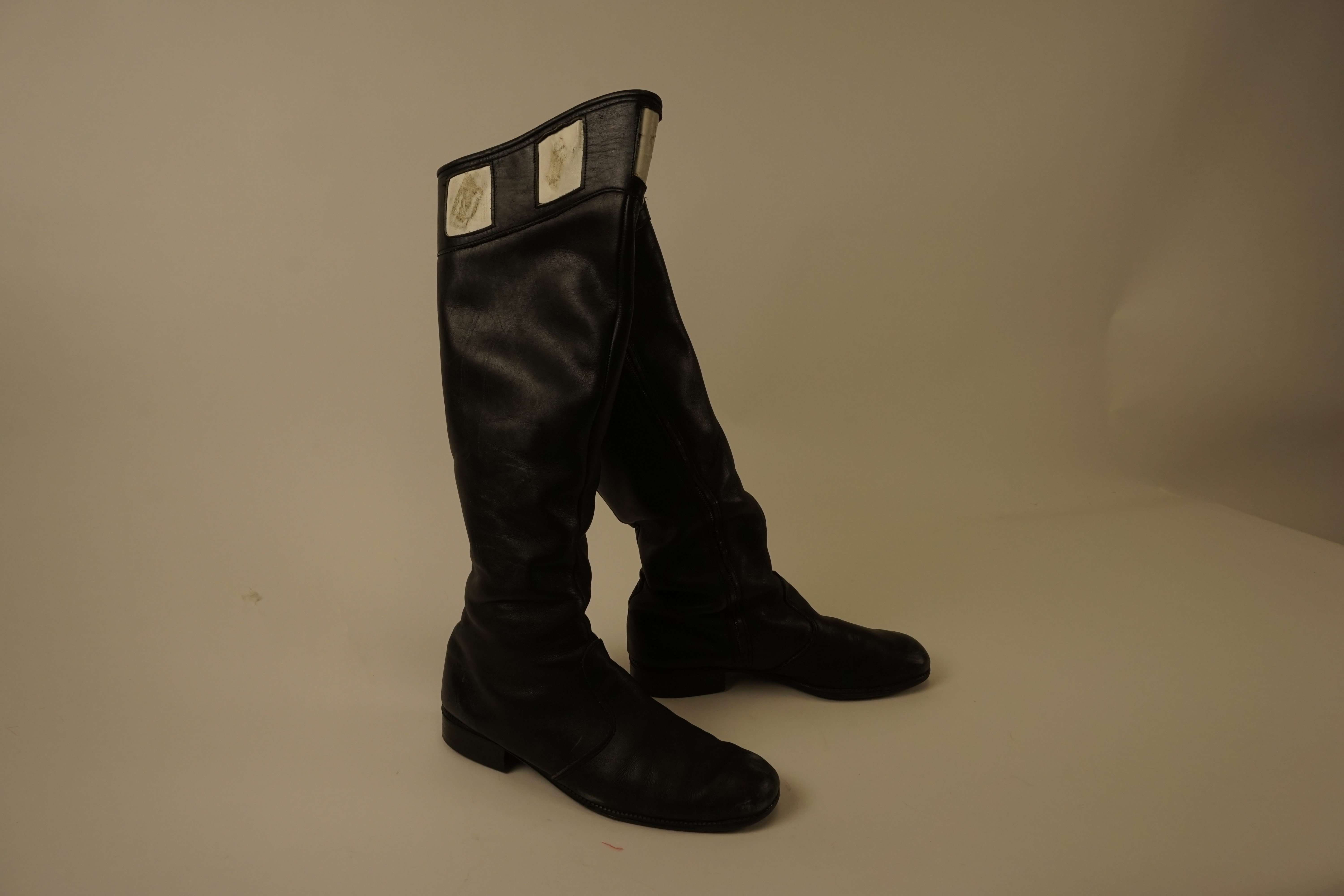 Deel prinsenpak: 1 paar kniehoge zwarte laarzen met versiering in wit leder
