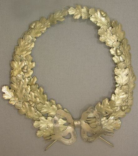 Lauwerkrans nationale wedstrijd Meerssen - 1934, materiaal: zilver of verzilverd metaal, afmetingen: diameter ca. 22 cm, lauwerkrans van 32 eikenbladeren met 6 eikels en onderaan een symmetrisch vormgegeven banderole-lint met daarop het inschrift: 'NAT. WEDSTR. 1934 MEERSSEN 1E PR. KORPS AANGEB. D.Dr. v. AUBEL'