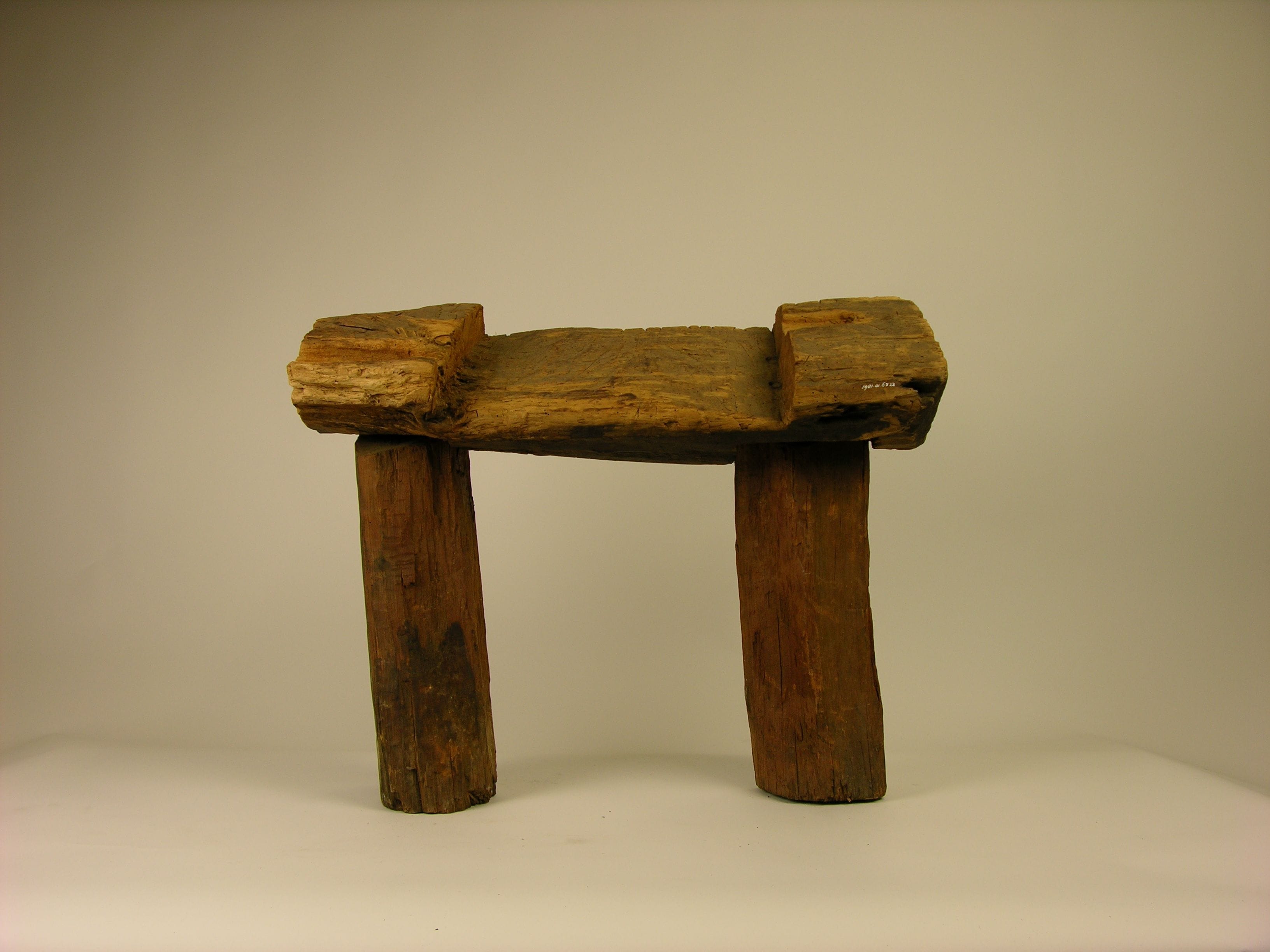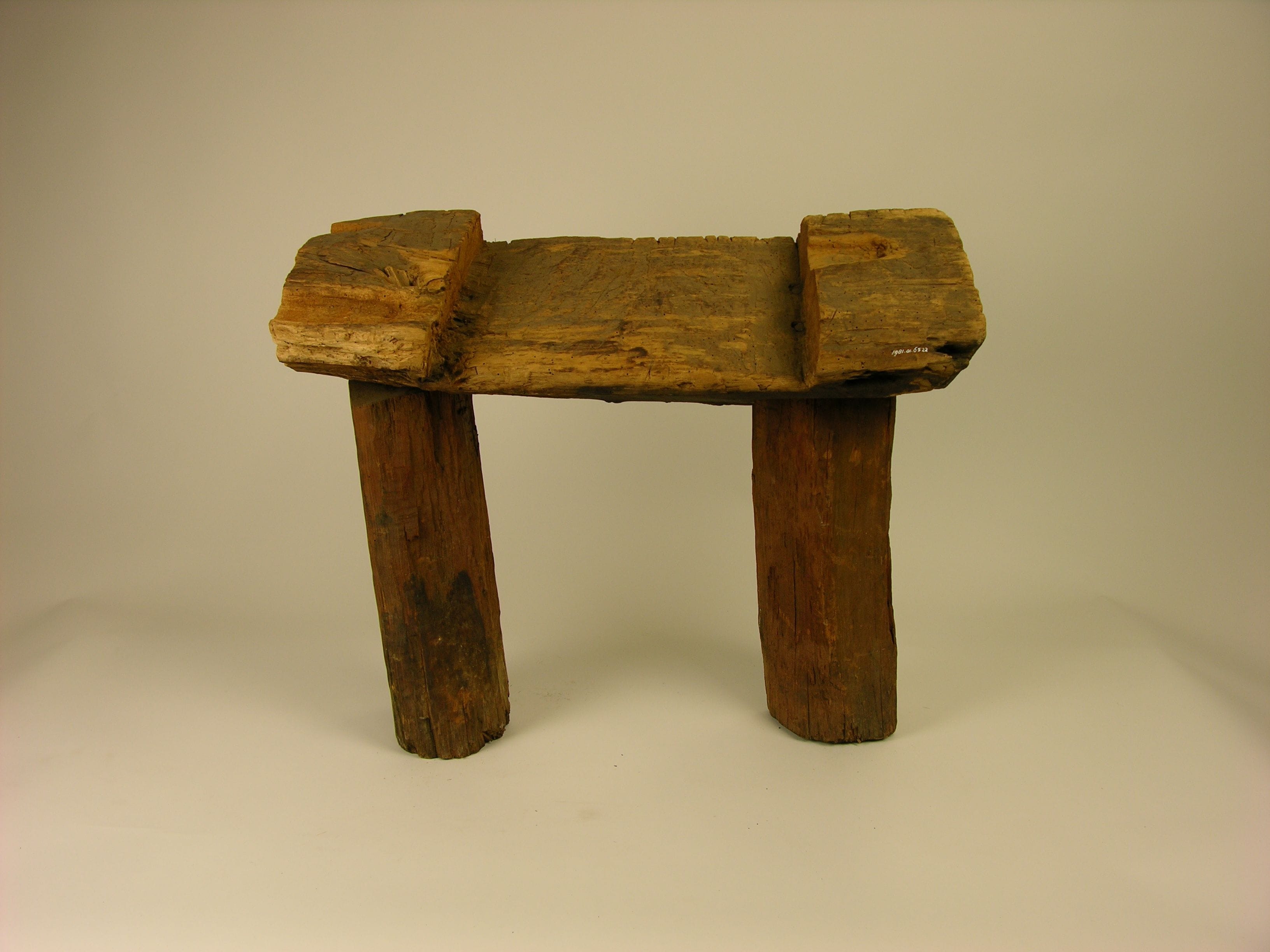 Ruw-houten werktafel waarop de klompenmaker de klomp uitholt. de uitholling in de heulbank meet 36 x 24 cm