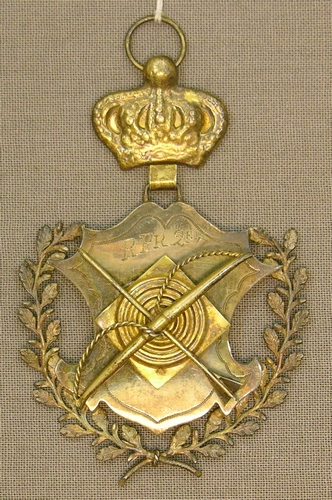 Prijsmedaille handboogschutterij St. Trudo Eindhoven 21/8 '27, materiaal: zilver (deels verguld), recto: schildje met opgelegde schietschijf waaromheen pijl en boog. scharnierend kroontje met draagringetje, het schild met opschrift 'RPr 2e 2' wordt aan weerszijden omsloten door lauwertakken, verso: inschrift 'St. Trudo Eindhoven 21/8 '27, afmetingen 8 x 4,9 x 0,7 cm Prijsmedaille handboogschutterij St. Trudo Eindhoven ...