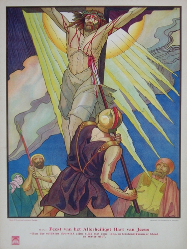 Schoolplaat: No 71 Feest van het Allerheiligst Hart van Jezus. Gesigneerd, gemonogrammeerd (met monogramteken) en gedateerd in voorstelling r.b..: Jos. Speybrouck 34, onder voorstelling r.o.: Chromolith. J.L. Goffart SA Bruxelles, l.o. logo van Liturgisch Apostolaat Uit de reeks 'Liturgisch apostolaat'