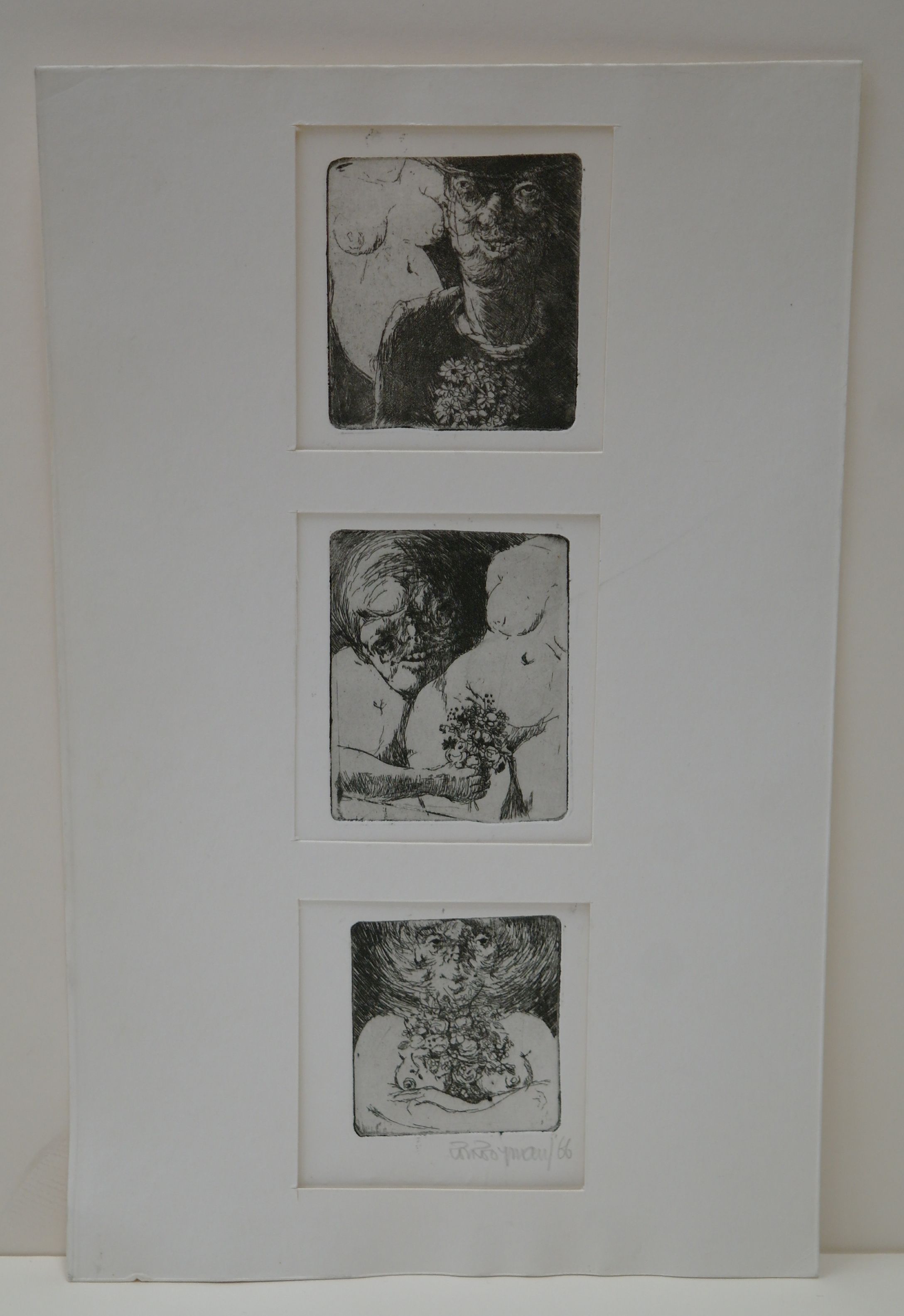 Maart, April, Mei - 1966, etsen in zwart/papier, 73 x 67 mm, 84 x 65 mm en 65 x 59 mm (drie op één blad), gesigneerd en gedateerd in potlood onder platen r.o.: Ron Rooymans '66