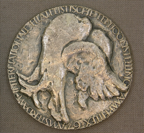 Voorzijde: zittende postduif die de vleugels schudt. opschrift: 'INTERNATIONALE FILATELISTISCHE TENTOONSTELLING AMPHILEX 67 AMSTERDAM'. Keerzijde: vlak, geen voorstelling Opschrift Positie: voorzijde Opschrift Type: randschrift Opschrift Inhoud: INTERNATIONALE FILATELISTISCHE TENTOONSTELLING AMPHILEX 67 AMSTERDAM Productie reden: ter gelegenheid van de Amphilex filatelie tentoonstelling te Amsterdam in 1967