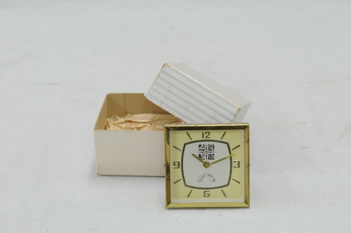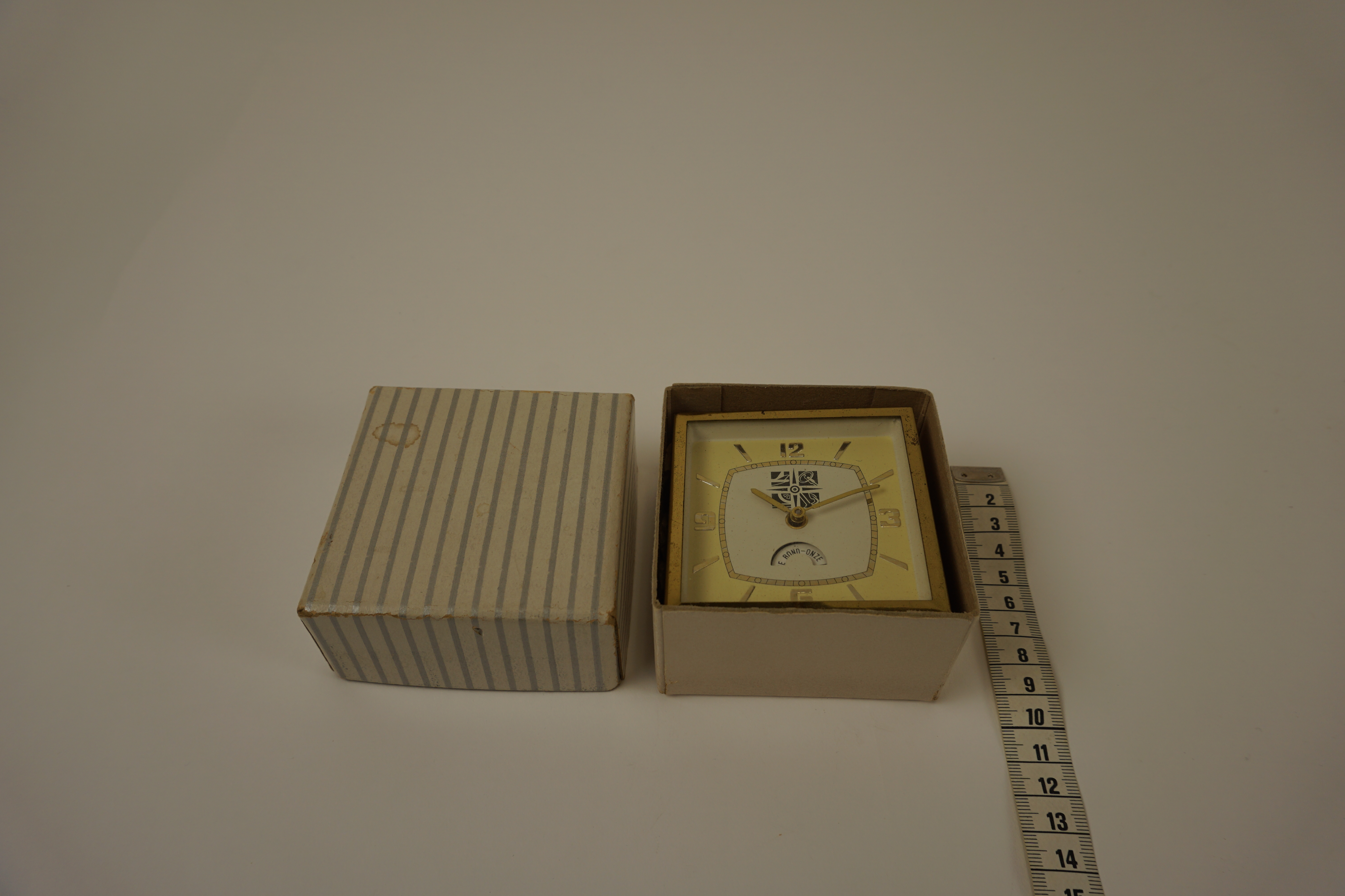 Wekkertje met opschrift wijzerplaat: 'K.B.V. onze bond - onze kracht'. De K.B.V. kan de Katholieke Bond voor vervoerspersoneel zijn. De cijfers 3, 6, 9 en 12 zijn aangegeven, de overige tijdsaanduidingen met streepjes. Materiaal: metaal (messing) en karton. In een doosje