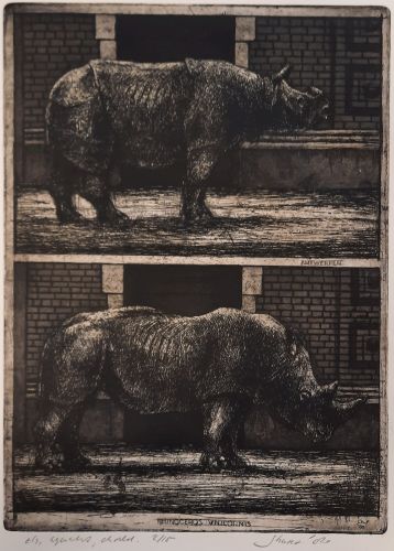 gesigneerd en gedateerd r.o.: J.h.f. '80 geannoteerd midden: Antwerpen en m.o.: Rhinoceros unicornis geannoteerd, genummerd, gesigneerd en gedateerd in potlood onder plaat: ets, aquatint, dr nld. 2/15. 2/15 j hurx '80 inventarisnummer Sociale Dienst: GW 3714 bedrag BKR: onbekend