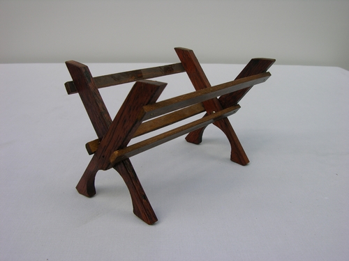 Miniatuurmodel van een zogenaamde houten 'ezel' die regionaal gebruikt wordt om het vlas te binden (Groningen ?). Tussen twee elkaar kruisende staanders bevinden zich voor dit doel aan weerszijden twee verbindingslatten.