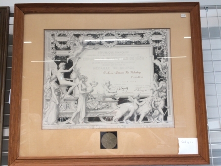 Ingelijste medaille en gravure, uit de collectie Draisma van Valkenburg te Leeuwarden betreffende levertraan productie