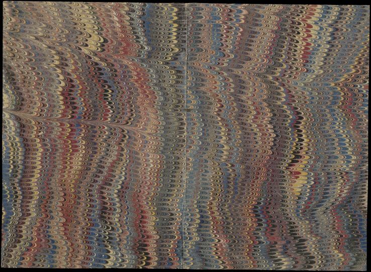 Blad met marmer in non pareil patroon, in rood, blauw, geel, groen en zwart, oud boekomslag