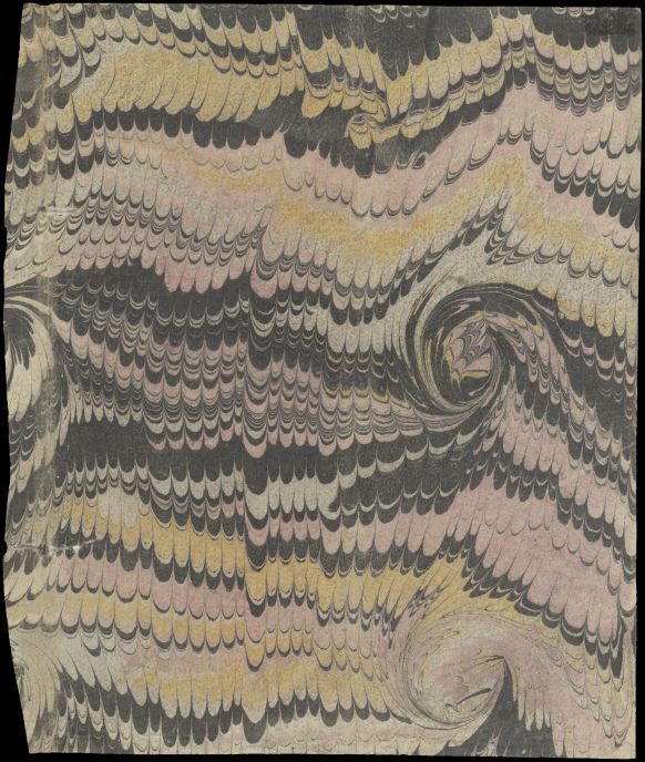 Blad met marmer in spiraalkamwerktechniek, in zwart, rose en geel, oud boekomslag