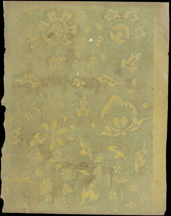 Blad geel geverfd brocaatpapier met bloem- en fruitmotieven, oud boekomslag