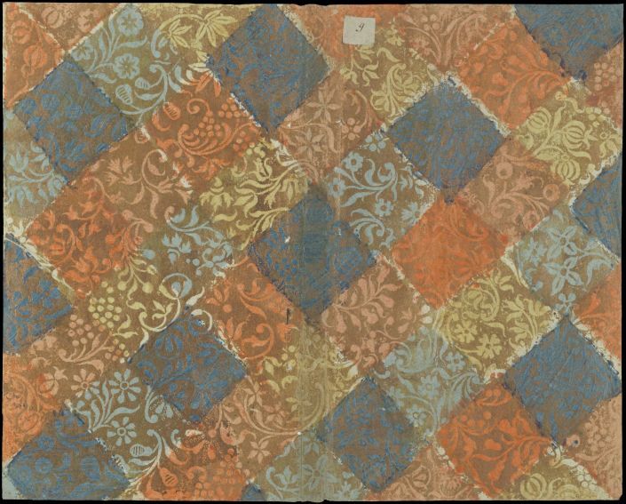 Blad in veelkleurige blokken geverfd bronsvernispapier met bloem- en fruitmotieven, oud boekomslag